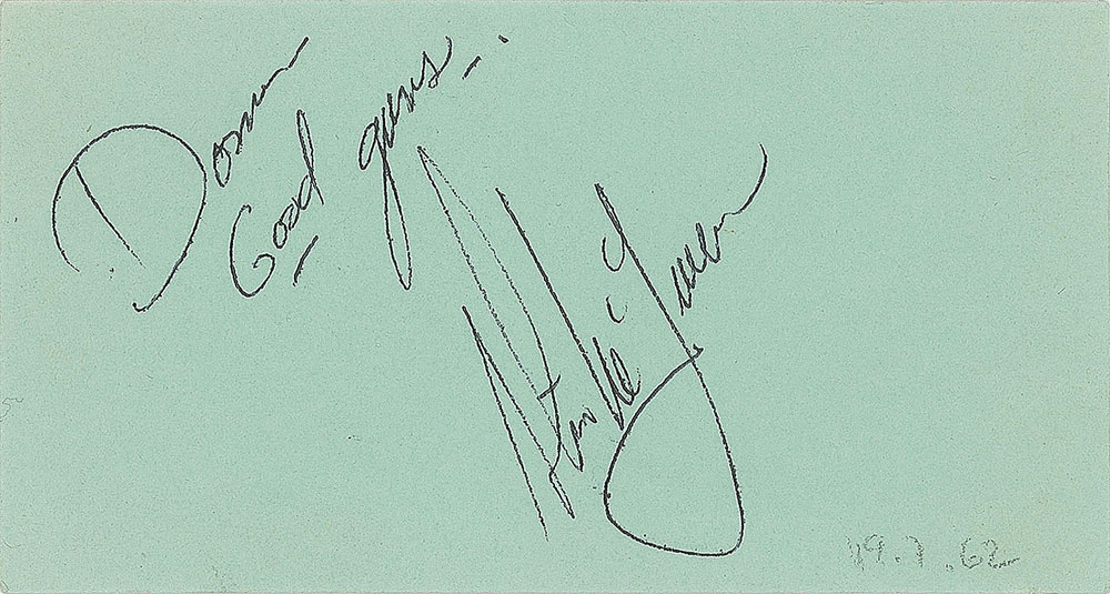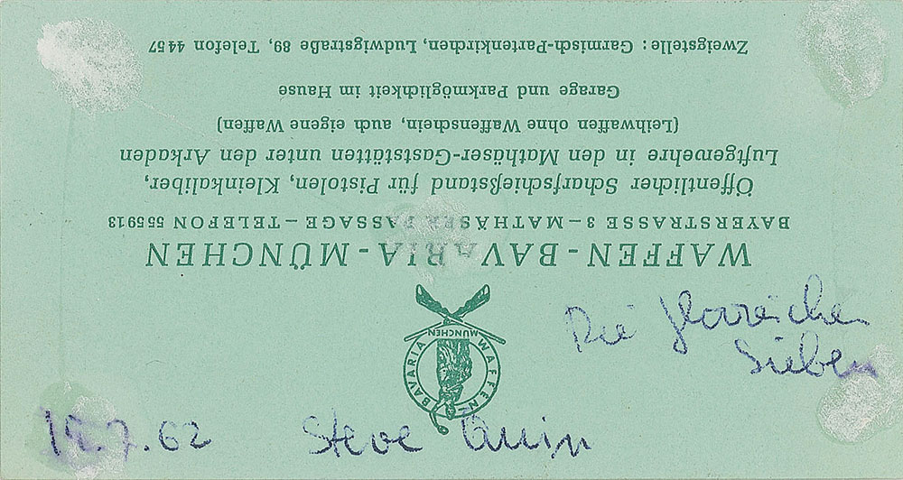 Vintage ballpoint signature and inscription, "Donn—Good guns, Steve McQueen,” on the reverse of a light green 4.75 x 2.5 card for a German gun shop, bearing a 1962 collector's date notation. In fine condition.