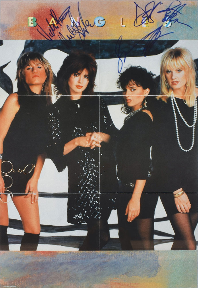 CBS Records 45 RPM single record for 'Manic Monday / In a Different Light,' signed on the unfolded 14.25 x 21.75 poster sleeve in blue felt tip by Susanna Hoffs, Vicki Peterson, Michael Steele, and Debbi Peterson. In fine condition. The record is included. From The John Brennan In-person Autograph Collection.
