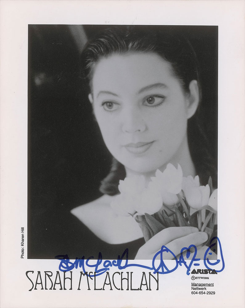 Satin-finish 8 x 10 Arista Records publicity photo for Sarah McLachlan, who has signed in blue felt tip with added peace, heart, and smiley face symbols. In fine condition. From The John Brennan In-person Autograph Collection.