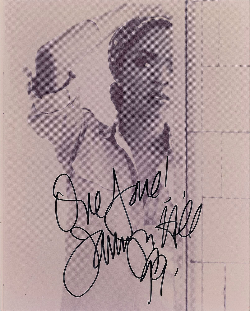Glossy 8 x 10 photo of Hill similar to how she's pictured on the cover of her single 'Doo Wop (That Thing),' signed in black felt tip, "One love! Lauryn Hill, 99." In fine condition, with slightly grainy image quality. From The John Brennan In-person Autograph Collection.