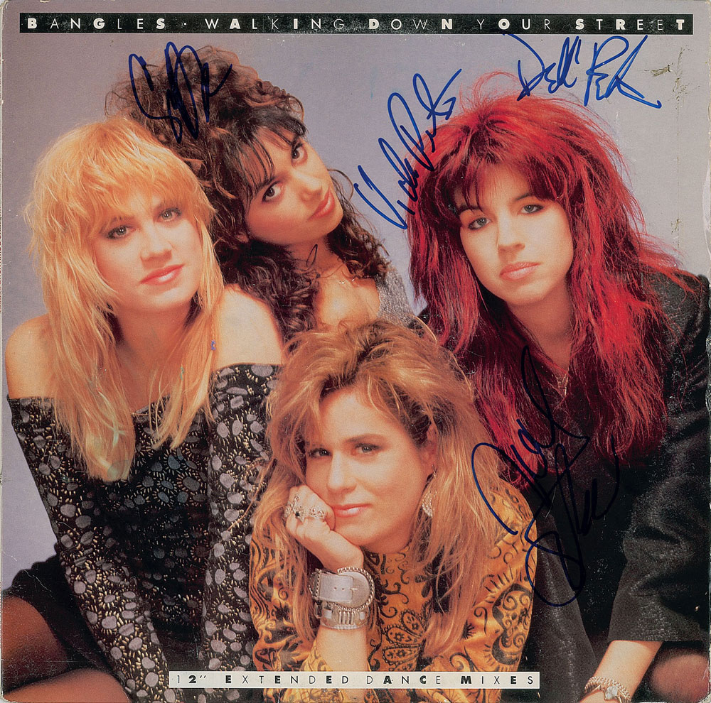 'Walking Down Your Street' promotional single album signed on the front cover in blue felt tip by Susanna Hoffs, Vicki Peterson, Michael Steele, and Debbi Peterson. In very good to fine condition, with some gouging and old sticker residue to the upper right. The record is included. From The John Brennan In-person Autograph Collection.