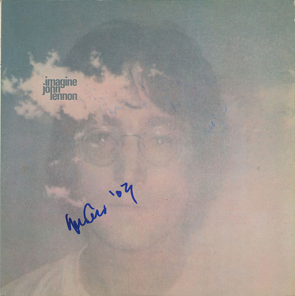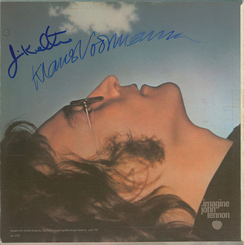 Imagine album signed on the front cover in blue felt tip, "Yoko Ono, '03," and on the back cover, "Klaus Voormann" and "Jim Keltner." In fine condition. The record is included. From The John Brennan In-person Autograph Collection.
