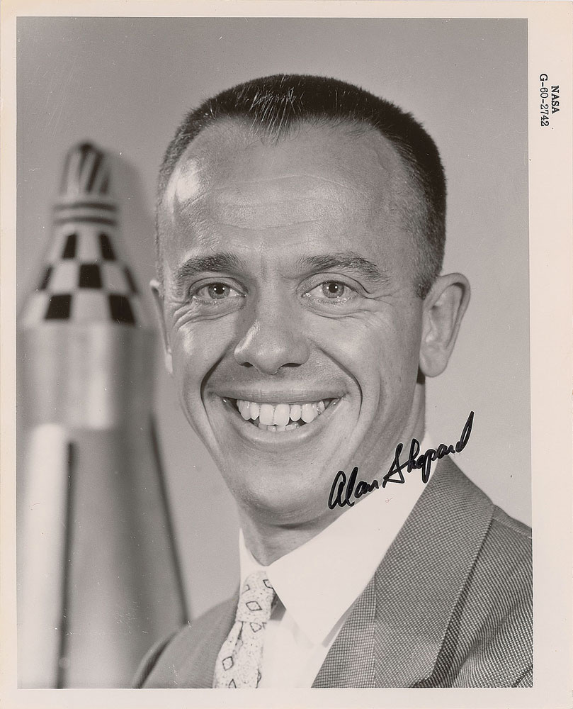 Official glossy 8 x 10 black-numbered NASA photo of Shepard in a suit and tie, neatly signed in black felt tip. Reverse bears purple NASA caption text. In fine condition, with a few small creases and two faint vertical bends.