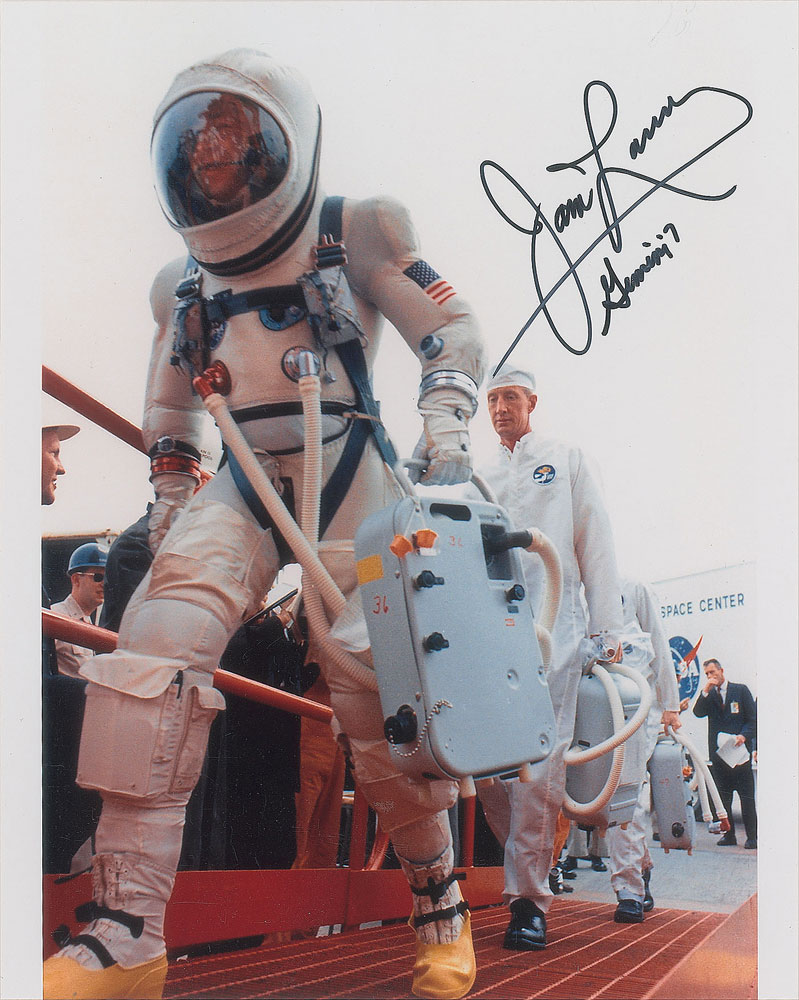 Color satin-finish 8 x 10 photo of James Lovell walking to the elevator at Pad 19 prior to the Gemini 7 launch, signed in black felt tip, "James Lovell, Gemini 7." In very fine condition.