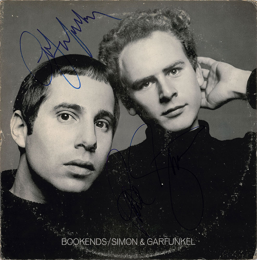 Bookends album signed on the front cover in blue felt tip by Paul Simon and Art Garfunkel. In very good to fine condition, with light scuffing and edge wear. The record is included. From The John Brennan In-person Autograph Collection.