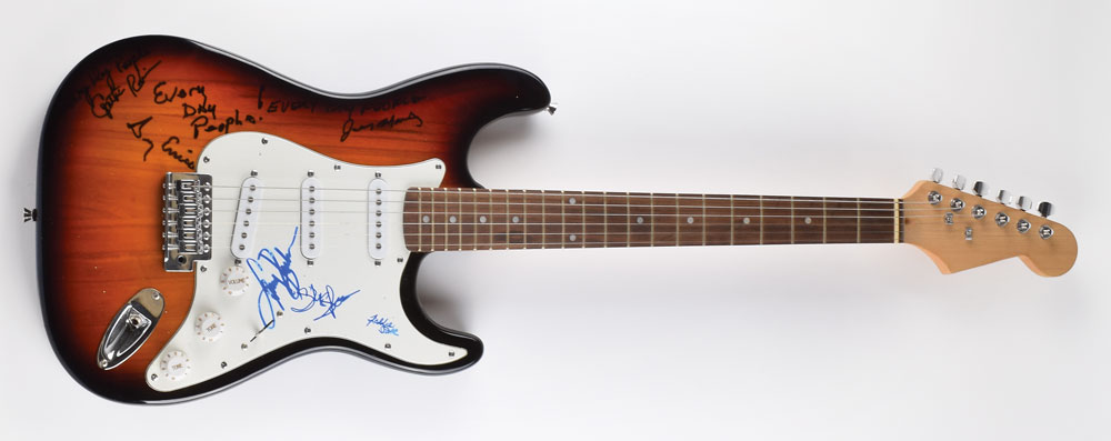 Black-bodied Stratocaster-style electric guitar with a sunburst finish, signed on the white pickguard in blue felt tip by Sly Stone, Larry Graham, and Freddie Stone, and on the body in black felt tip by Greg Errico, Cynthia Robinson, and Jerry Martini, with the latter three each adding "Every Day People." In fine condition, with slight smudging to the Graham and Freddie signatures. From The John Brennan In-person Autograph Collection.
