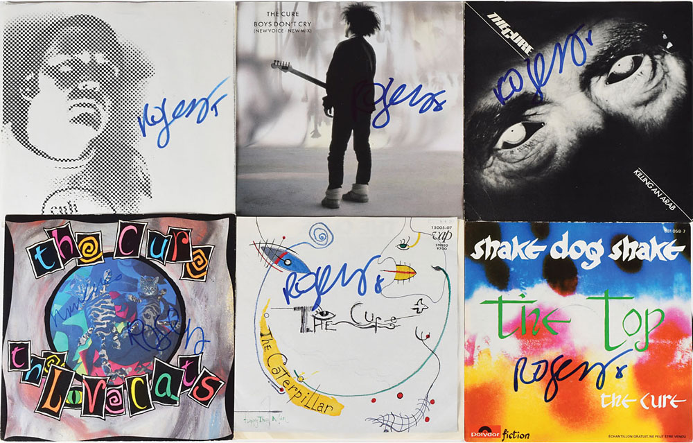 Group of six 45 RPM single records and one CD single, each signed on the front sleeve in blue felt tip by Robert Smith of The Cure, with titles including: 'Lovesong' (CD); 'Boys Don't Cry / Pillbox Tales'; 'Killing an Arab / 10:15 Saturday Night'; 'The Lovecats / Speak My Language'; 'The Caterpillar / Happy the Man'; 'Shake Dog Shake / The Top'; and 'I Dig You / I'm a Cult Hero' by Cult Hero. In overall fine condition. The CD and records are included. From The John Brennan In-person Autograph Collection.