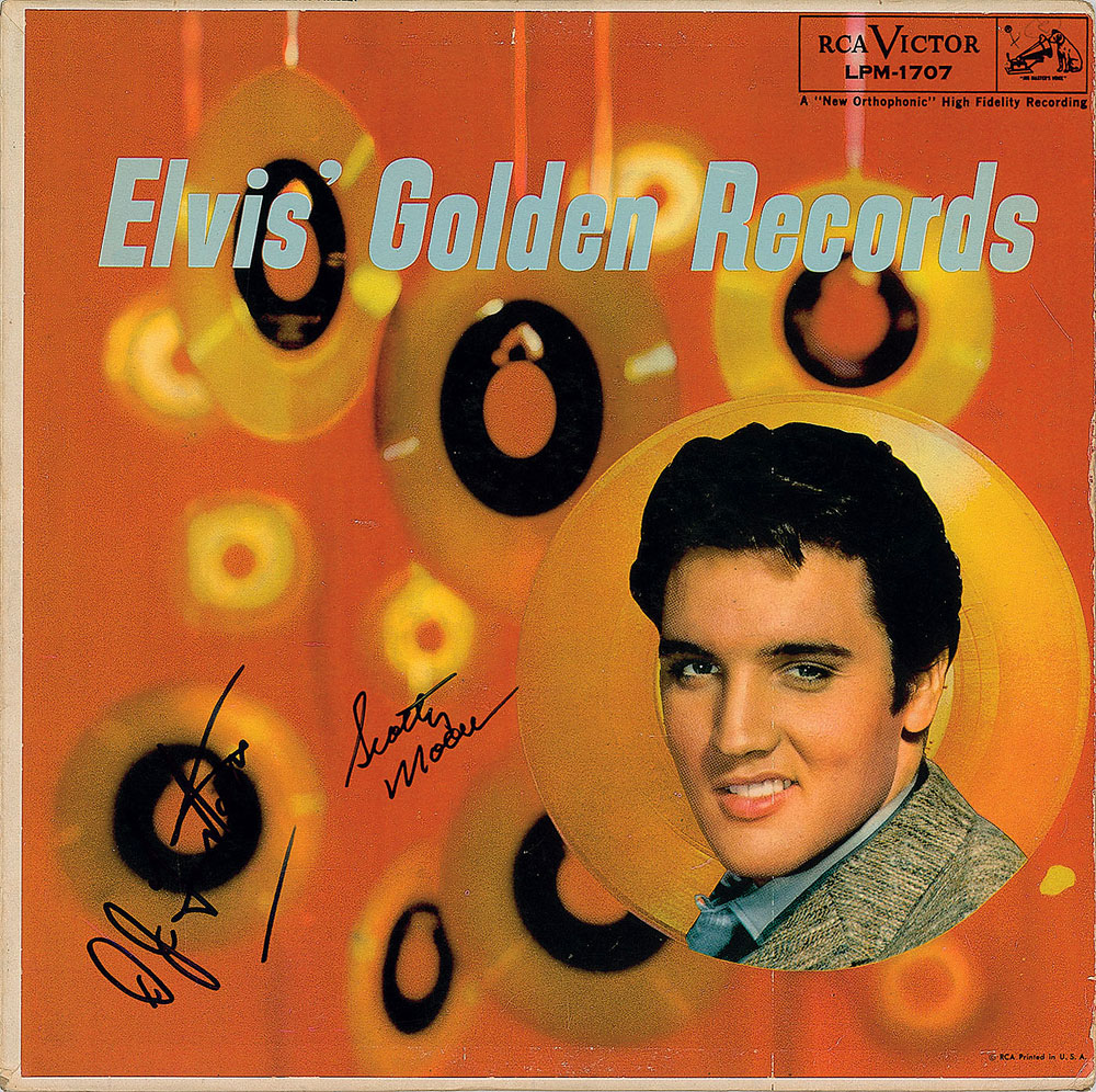 Elvis Golden Records album signed on the front cover in black felt tip by guitarist Scotty Moore and drummer D. J. Fontana. In fine condition. The record is included. From The John Brennan In-person Autograph Collection.