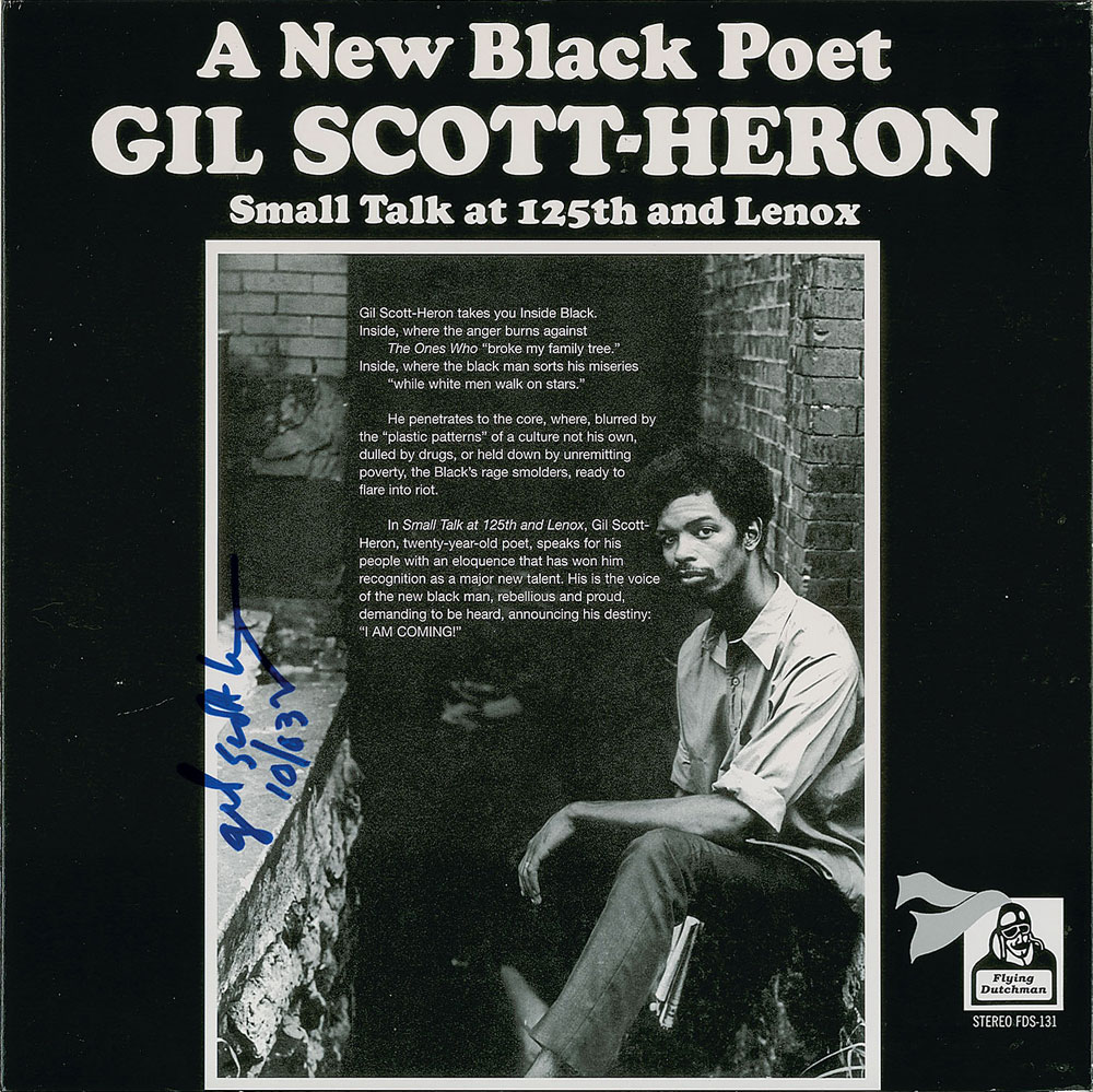 A New Black Poet—Small Talk at 125th and Lenox album signed vertically on the front cover in blue felt tip, "Gil Scott-Heron, 10/03." In fine condition. The record is included. From The John Brennan In-person Autograph Collection.