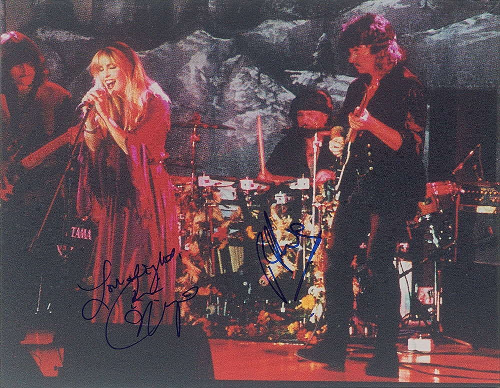 Color semi-glossy 14 x 11 photo of the traditional folk rock duo Blackmore's Night during a performance, signed in blue felt tip, "Ritchie Blackmore" and "Love & light, Candice Night." In fine condition, with grainy image quality. From The John Brennan In-person Autograph Collection.