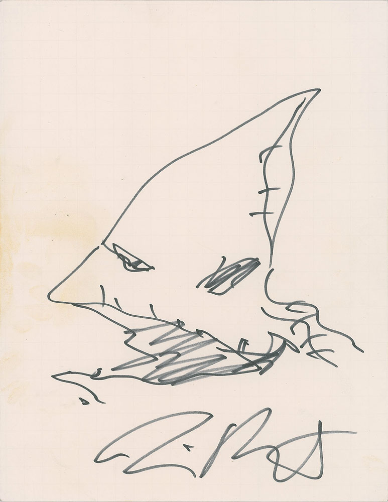 Original felt tip sketch of Oogie Boogie from the 1993 animated dark fantasy The Nightmare Before Christmas on an off-white 11 x 14 sheet, signed below by Tim Burton. In fine condition, with some light staining to the left side. From The John Brennan In-person Autograph Collection.