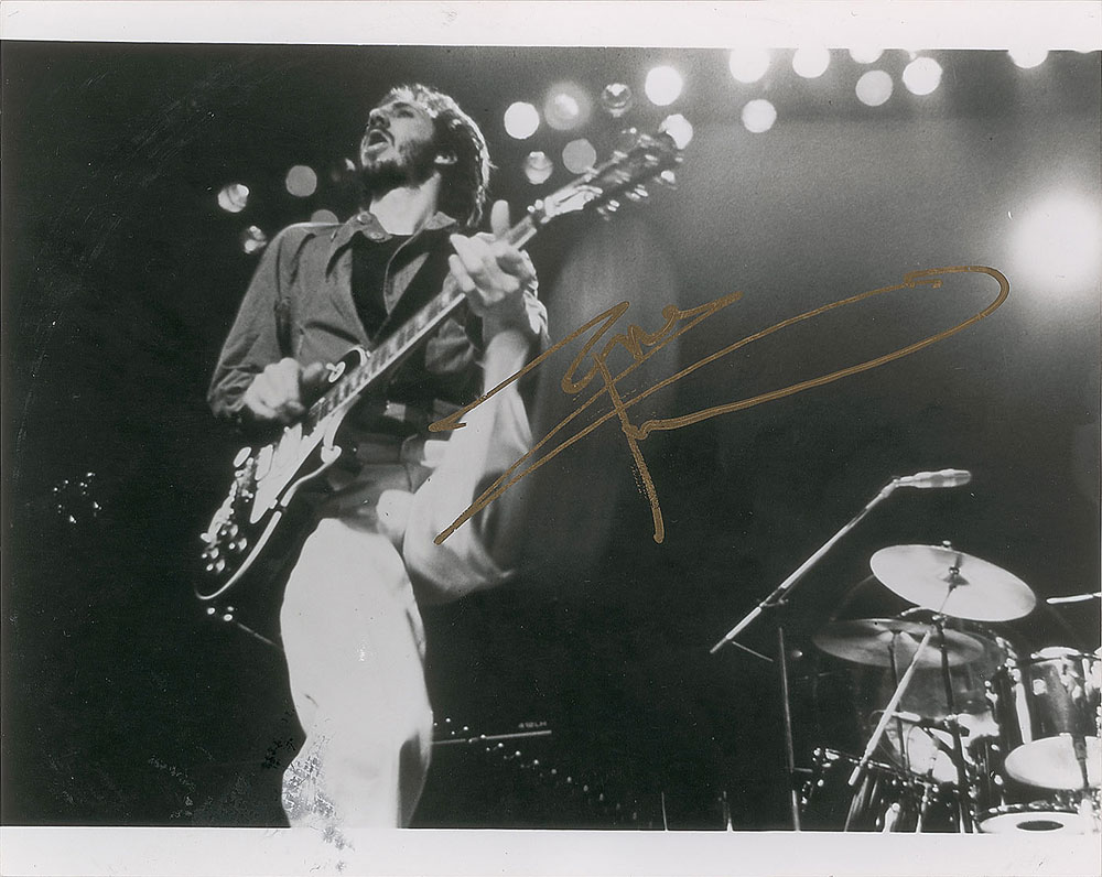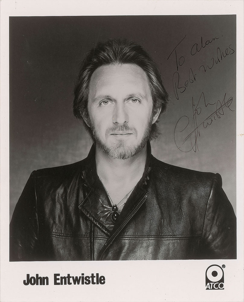 Group of three glossy photos signed by members of The Who: a 10 x 8 photo of Pete Townshend playing his guitar on stage, signed in gold ink by Townshend; a color 8 x 10 photo of The Who in their later years, signed in blue felt tip by Roger Daltrey; and an 8 x 10 ATCO Records publicity photo of John Entwistle, signed and inscribed in black ink, "To Alan, Best wishes, John Entwistle." In overall fine condition.