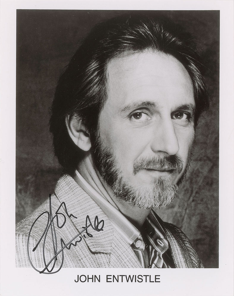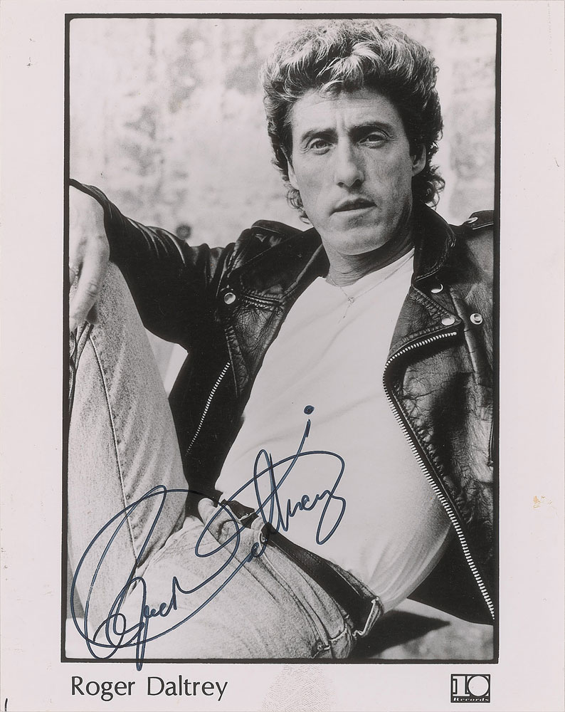 Group of three 8 x 10 publicity photos signed by members of The Who: a satin-finish 1989 Virgin Records promo still of Pete Townshend, signed in black felt tip; a glossy promo photo of John Entwistle, signed in black felt tip; and a glossy 10 Records promo shot of Roger Daltrey, signed in black felt tip. In overall fine condition.