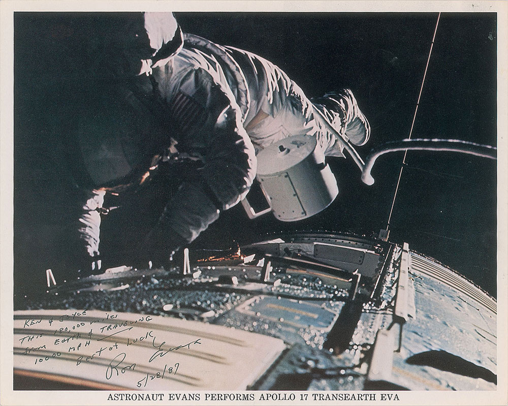 Official color 10 x 8 NASA lithograph of Evans performing his Apollo 17 EVA, signed and inscribed in black felt tip, "Ken & Joyce, This 180,000 miles from Earth & traveling 10000 MPH—Best of luck, Ron Evans, 5/28/87.” In fine condition.