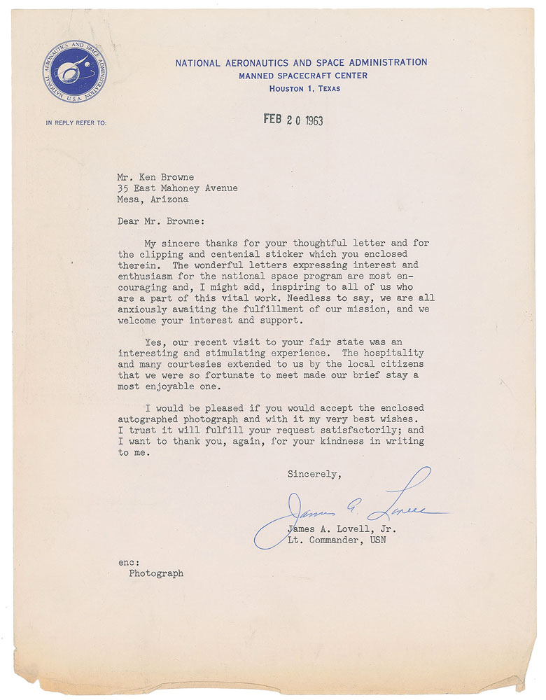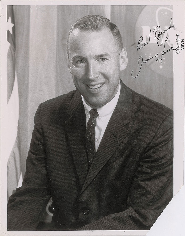 Two items: a vintage official glossy 8 x 10 black-numbered NASA photo of Lovell in a suit and tie, signed in fountain pen, "Best Regards, James Lovell"; and a TLS signed "James A. Lovell," one page, 8 x 10.5, NASA letterhead, February 20, 1963, in part: "The wonderful letters expressing interest and enthusiasm for the national space program are most encouraging and, I might add, inspiring to all of us who are a part of this vital work." In overall very good condition, with light edge paperclip impressions, missing lower right corner to the photo, and wear to the bottom edge of the letter.