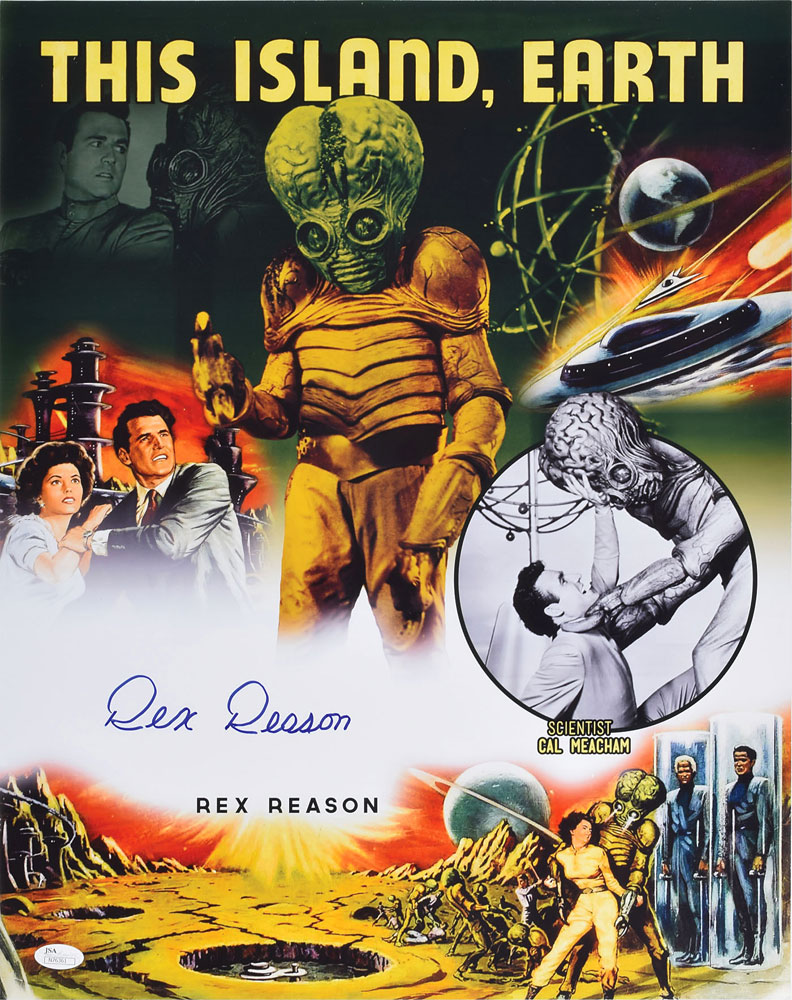 Color glossy 16 x 20 photo of the poster for the 1955 science fiction film This Island Earth, signed in blue felt tip by Rex Reason, who starred in the film as Dr. Cal Meacham. In fine condition, with a JSA label affixed to the lower left corner. Accompanied by a certificate of authenticity from JSA.