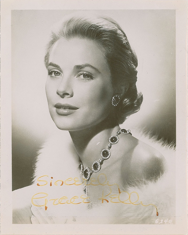 Vintage glossy 4 x 5 photo of Kelly in an elegant close-up pose, signed in ink, "Sincerely, Grace Kelly." In very good to fine condition, with a few light creases, and the signature faded but legible.