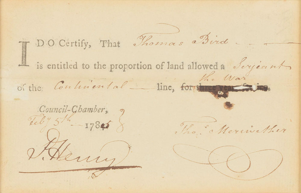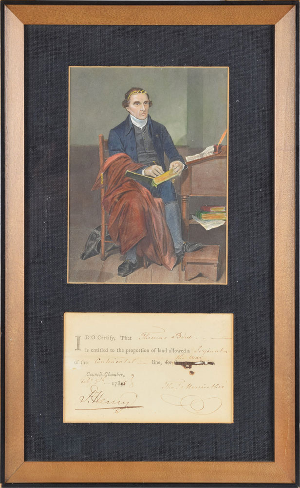 Partly-printed DS, signed “P. Henry,” one page, 5.5 x 3.5, February 5, 1785. Document certifying eligibility for a land bounty to a veteran of the Revolutionary War, in full: "I do certify, that Thomas Bird is entitled to the proportion of land allowed a Serjeant of the Continental line, for the War." Signed at the conclusion by Patrick Henry and Thomas Meriwether. Nicely matted and framed with a hand-colored engraving of Henry to an overall size of 9.5 x 15.5. In fine condition, with some ink erosion to the crossed-out words.