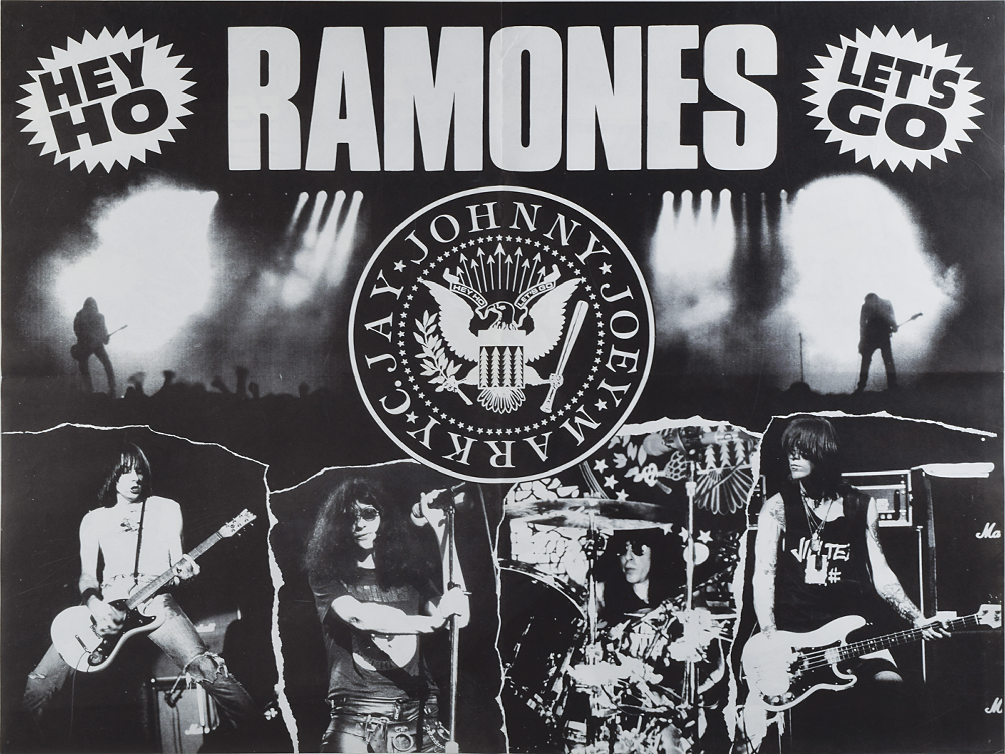 Original black-and-white 28.5 x 22 program poster featuring the Ramones and their seal, with "Hey Ho" and "Let's Go" at the top. The reverse features a collage of backstage passes and other Ramones ephemera, with an image of the band in one quadrant. Folded into quarters, rolled, and in fine condition.