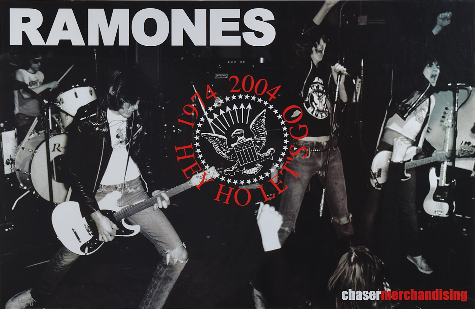 Two identical 30 x 20 Chaser Merchandising posters honoring the 30th anniversary of the Ramones, featuring a black-and-white image of the band in concert overlaid with a seal, encircled by red text, "1974, 2004, Hey Ho Let's Go." Rolled and in overall fine condition, with one marked on the back in black felt tip, "CJ's."