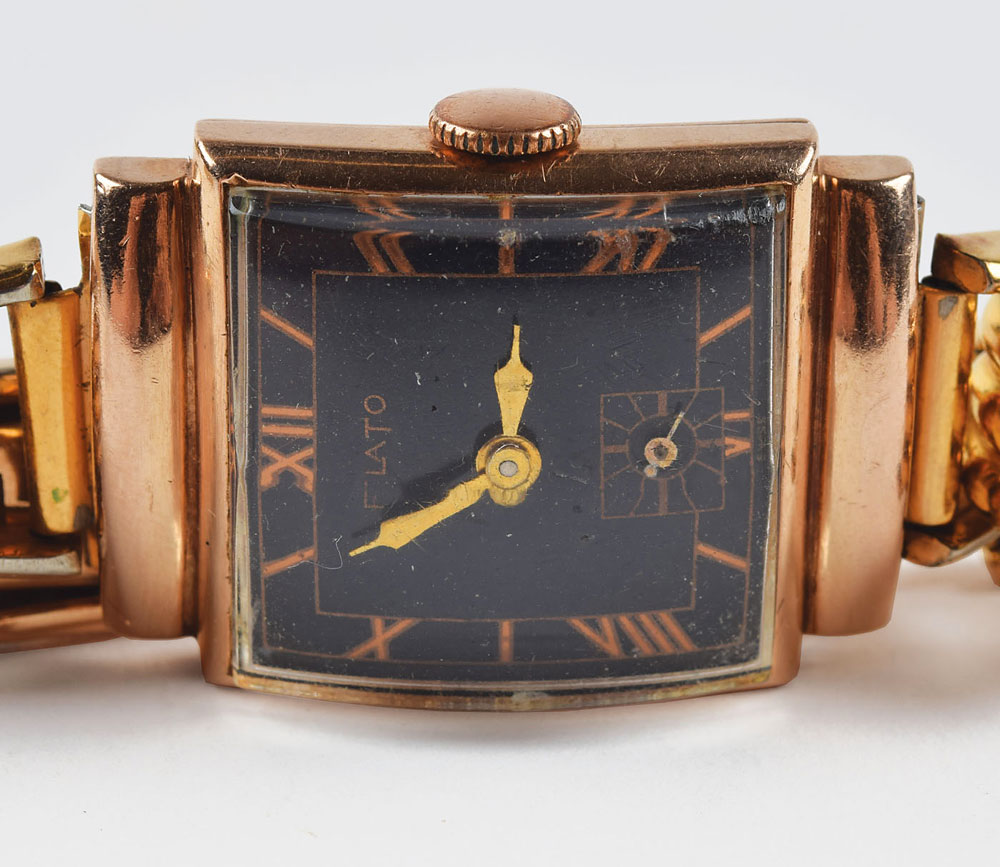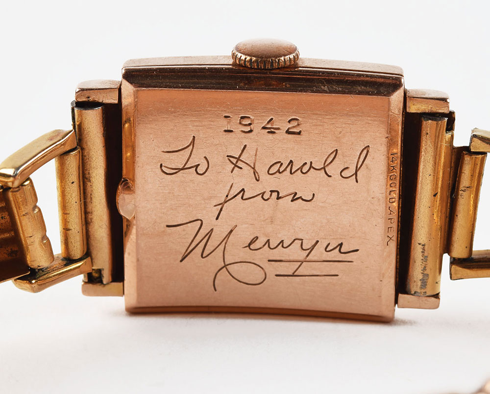 Desirable square-faced gold-tone circa late 1930s wristwatch by Paul Flato featuring a black dial with gold Roman numerals, engraved on the reverse in the form of Mervyn LeRoy's handwriting, "1942, To Harold, from Mervyn." The watch has a 17-jewel manual wind Kelbert Watch Co. movement, and the inside of the caseback is stamped with serial number "107902." The watch band's clasp is marked "Kreisler." In fine condition; the watch appears to properly function.