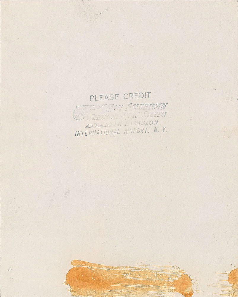 Original vintage glossy 7.5 x 9.25 silver gelatin photo of Monroe and Arthur Miller at the foot of a Pan American Airways jet's boarding stairs. Reverse bears a Pan American credit stamp. In fine condition, with scattered light creasing.