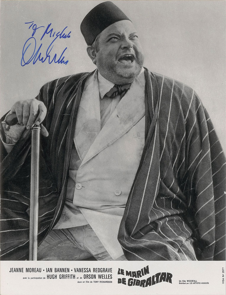 Glossy 8 x 10.5 French publicity photo of Welles as Louis de Mozambique from the 1967 drama The Sailor from Gibraltar, signed and inscribed in blue felt tip, "To Michele, Orson Welles.” In very good to fine condition, with scattered creasing.