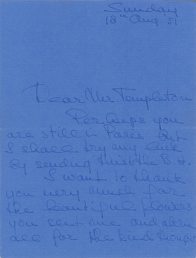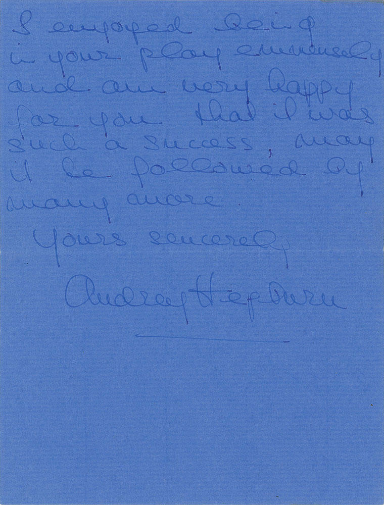 ALS, two pages, 5.25 x 7, August 18, 1951. Letter to screenwriter William Templeton, in full: "Perhaps you are still in Paris but I shall try my luck by sending this to the B. H. I want to thank you very much for the beautiful flowers you sent me and above all the kind thought. I enjoyed being in your play immensely and am very happy for you that it was a such a success, may it be followed by many more." In fine condition. Hepburn starred as Celia in Templeton's The Silent Village, an episode of the second season of BBC Sunday-Night Theatre, which originally aired on August 5, 1951.