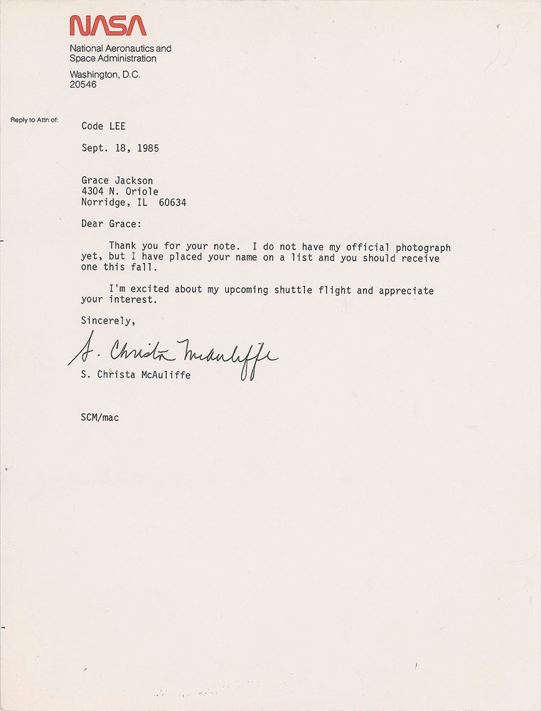 TLS signed “S. Christa McAuliffe,” one page, 8.25 x 11, NASA letterhead, September 18, 1985. Letter to Grace Jackson, in full: "Thank you for your note. I do not have my official photograph yet, but I have placed your name on a list and you should receive one this fall. I'm excited about my upcoming shuttle flight and appreciate your interest." In fine condition, with a bit of light creasing. Accompanied by an unsigned official NASA lithograph of McAuliffe.