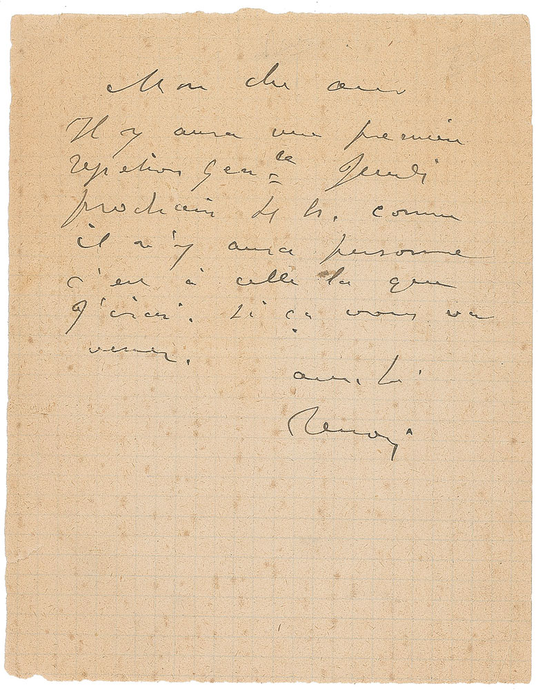 ALS in French, signed “Renoir,” one page, 4 x 5.25, no date. Letter to a friend, about attending the dress rehearsal of a production. In part (translated): "My dear friend…as there won't be anyone [at the dress rehearsal], that's the one I will attend. If it appeals to you, come along." In fine condition, with scattered light foxing. Theater and circus venues were popular subjects for the Impressionists; theatergoers were a particular favorite for Renoir, who captured audiences in paintings such as 'La Loge' and 'La Premiere Sortie.'
