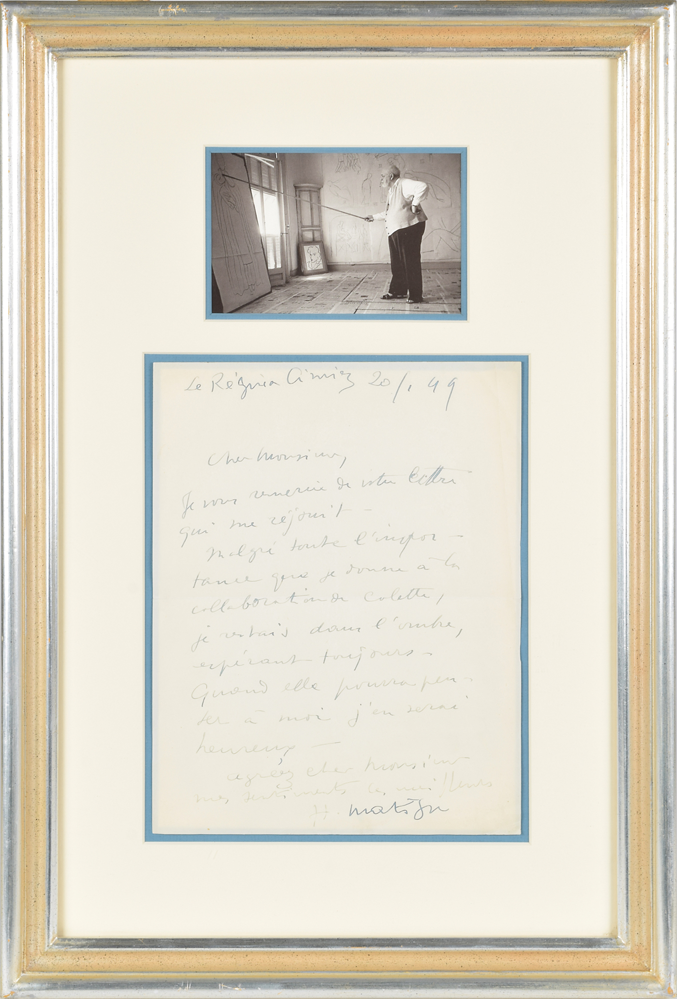 ALS in French, signed “H. Matisse,” one page, 8.25 x 10.5, January 20, 1949. Letter concerning a collaboration with novelist Colette. In part (translated): "Thank you for you letter which makes me quite happy. Although [the prospect of] Colette's collaboration is very important to me, I was remaining in obscurity, full of hope. When she has a chance to think of me, that will make me happy." Handsomely mounted, matted, and framed with a portrait of Matisse in his studio to an overall size of 15 x 22. In very good to fine condition, with intersecting folds and edge creasing; Matisse's last name is very bold as he apparently switched pens due to dwindling ink flow. The collaboration he discusses may be for Colette's La Vagabonde, published in 1951, which included a lithograph portrait frontispiece by Matisse. A beautifully presented letter offering a desirable connection between French art and literature.