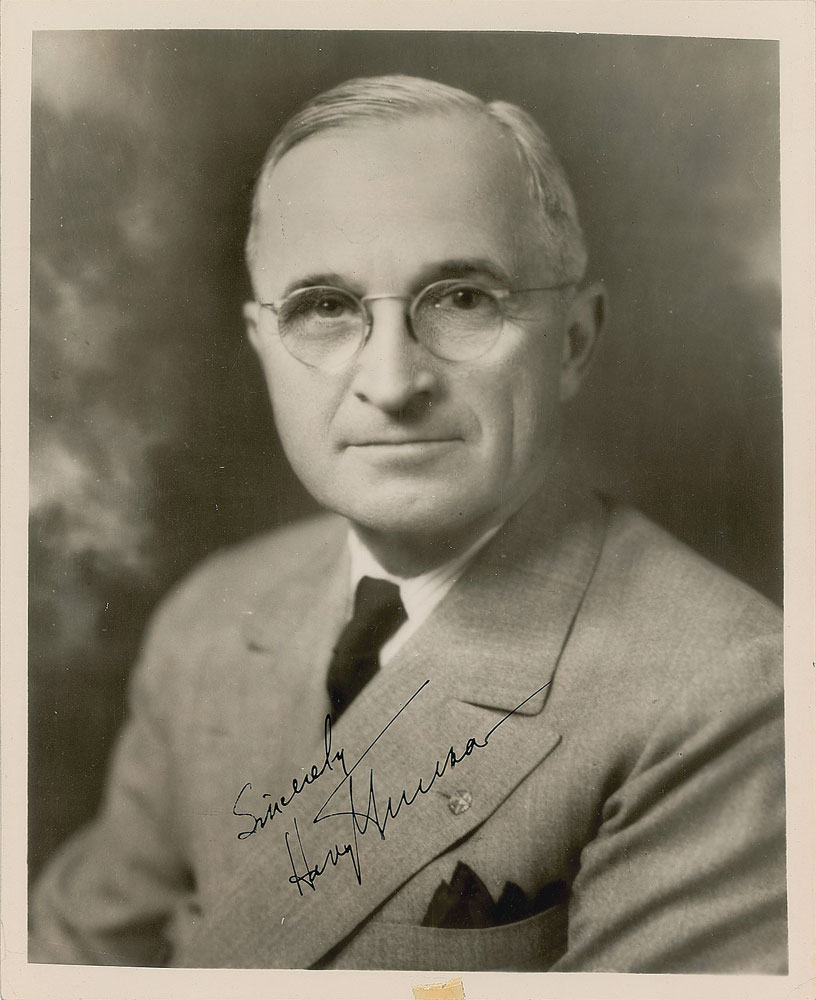 Vintage glossy 8.25 x 10 bust-length portrait of Truman in a handsome forward-facing pose, signed in fountain pen, "Sincerely Harry S. Truman." In fine condition, with scattered light creasing, and a small piece of old tape to bottom border.