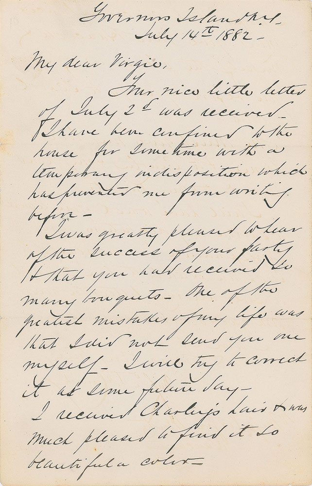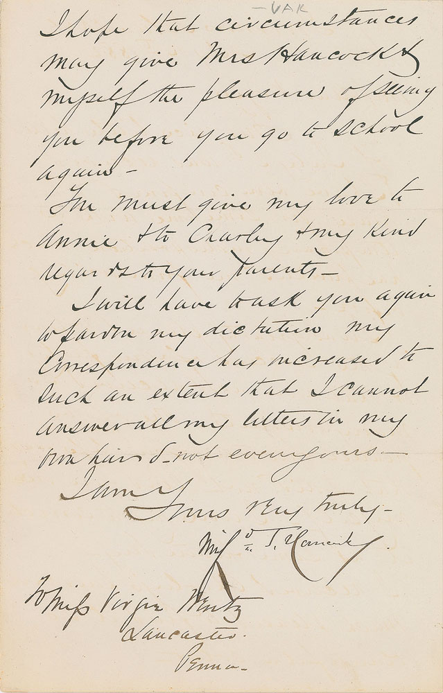 LS signed “Winf'd S. Hancock,” two pages on two adjoining sheets, 5.5 x 8.5, July 14, 1882. Written from Governors Island, a letter to Virgie Wentz, in part: "Your nice little letter of July 2d was received. I have been confined to the house for some time with a temporary indisposition which has prevented me from writing before. I was greatly pleased to hear of the success of your party & that you had received so many banquets. One of the greatest mistakes of my life was that I did not send you one myself. I will try to correct it at some future day. I received Charley's hair & was much pleased to find it so beautiful a color…I will have to ask you again to pardon my dictation my correspondence has increased to such an extent that I cannot answer all my letters in my own hand." In fine condition.