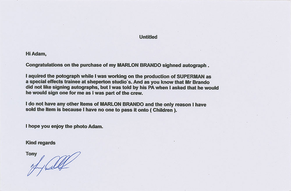 Exquisite vintage matte-finish 8 x 10 photo of Brando as Jor-El in the 1978 film Superman, signed and inscribed in the lower border in blue ink, "To Tony—Most pleasant memories, Sincerely, Marlon Brando.” In fine condition, with a couple of light horizontal streaks across the image. Accompanied by a letter of provenance from the original recipient, stating that he received this while working on the production of Superman as a special effects trainee at Shepperton Studios. A rare and magnificent signed portrait of the legendary actor.
