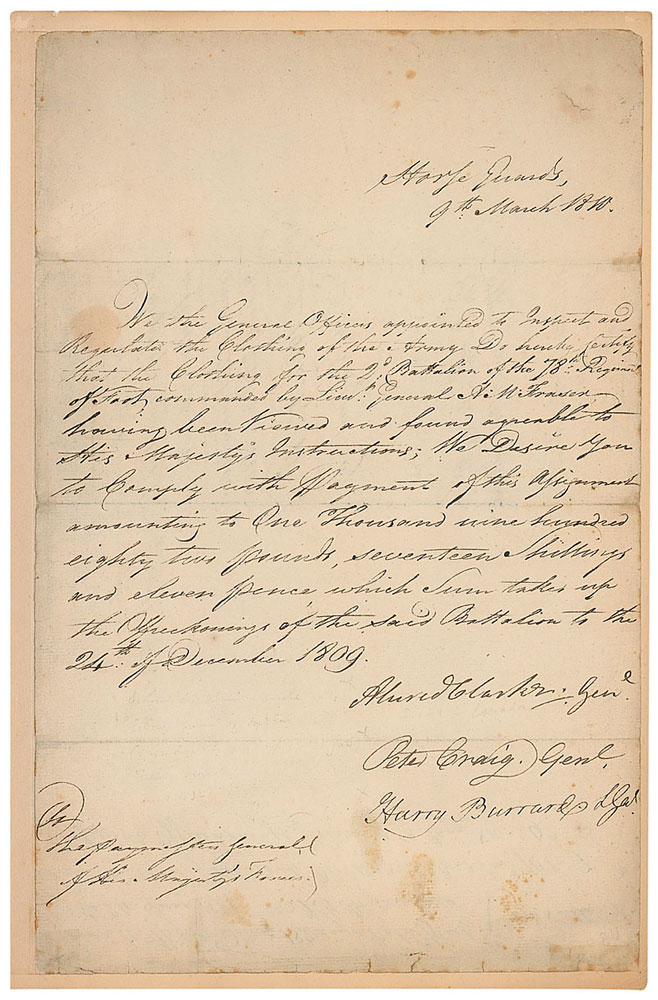 British field marshal (1744-1832) who took charge of all British troops in Georgia in May 1780 and was then deployed to Philadelphia to supervise the evacuation of British prisoners of war at the closing stages of the Revolution. Manuscript DS, signed "Alured Clarke: Genl," one page, 8.25 x 13, March 9, 1810. Document, identified above the date as coming from "Horse Guards," in part: "We the General Officers appointed to Inspect and Regulate the Clothing of the Army Do hereby Certify that the Clothing for the 2d Battalion of the 78th Regiment of Foot; commanded by Lieut. General A. M. Fraser having been Viewed and found agreeable to His Majesty's Instructions." Signed at the conclusion by Clarke, and countersigned by Peter Craig and Harry Burrard. Document is affixed by its left edge to a slightly larger sheet. In very good condition, with scattered toning, soiling, and foxing.