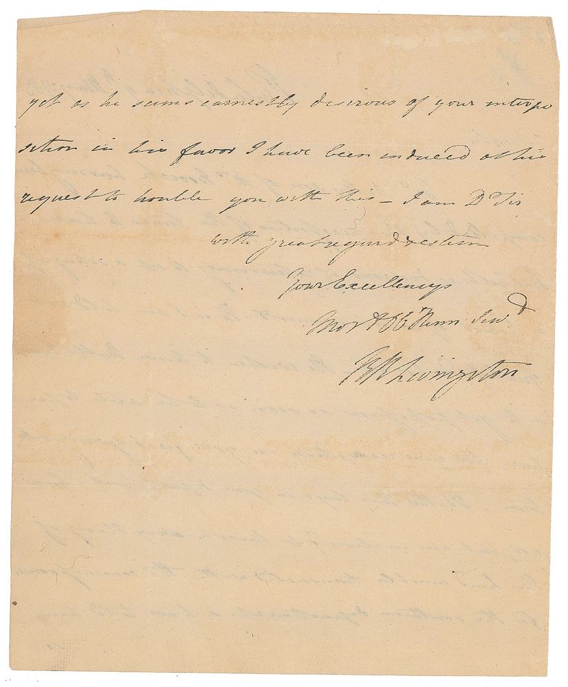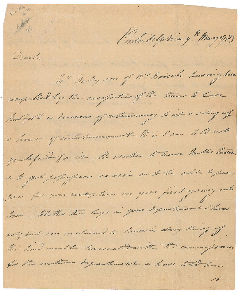 Lawyer, politician, and diplomat from New York (1746-1813) known as 'The Chancellor,' who was one of the five original drafters of the Declaration of Independence. ALS signed “R. R. Livingston,” one page both sides, 7.5 x 9, May 9, 1783. Letter to Governor George Clinton of New York, in part: "Mr. Dally, son of Mrs. Booreh, having been compelled by the necessities of the times to leave New York is desirous of returning to it and setting up a house of entertainment. He is, I am told, well qualified for it—He wishes to have Hull's Tavern and to get possession so soon as to be able to prepare for your reception on your first going into town—Whether this lays in your department I know not…He seems earnestly desirous of your interposition in his favor." In fine condition, with seal-related paper loss to the neatly detached integral address leaf (which retains an incomplete red wax seal).