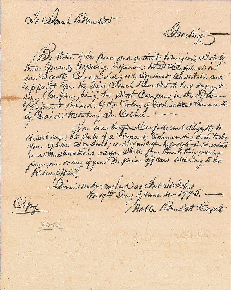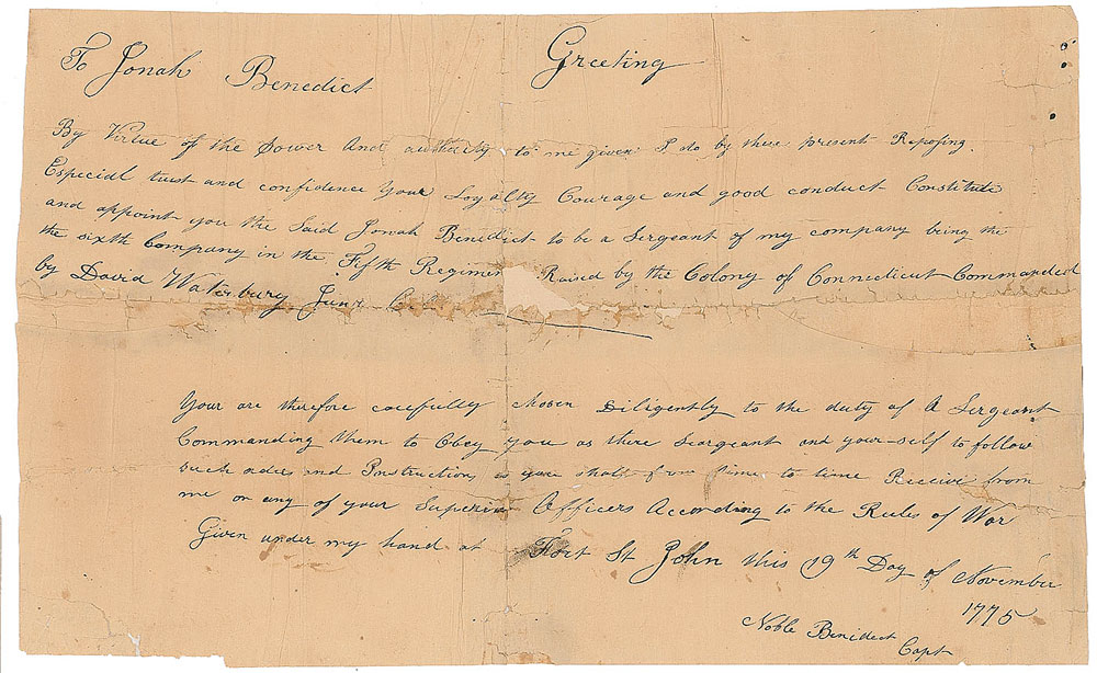 Revolutionary War-dated manuscript DS, signed “Noble Benedict Capt,” one page, 13.75 x 8.25, November 19, 1775. Document issued at "Fort St. John" appointing Jonah Benedict as a sergeant in "the Fifth Regiment Raised by the Colony of Connecticut Commanded by David Waterbury Jur. Col." Includes a manuscript copy of Jonah Benedict's affidavit attesting to his service and imprisonment by the British as well as the aforementioned appointment as sergeant, dated 1839. In good to very good condition, with overall creasing, edge tears, and repaired paper loss along rough intersecting folds, not affecting readability.