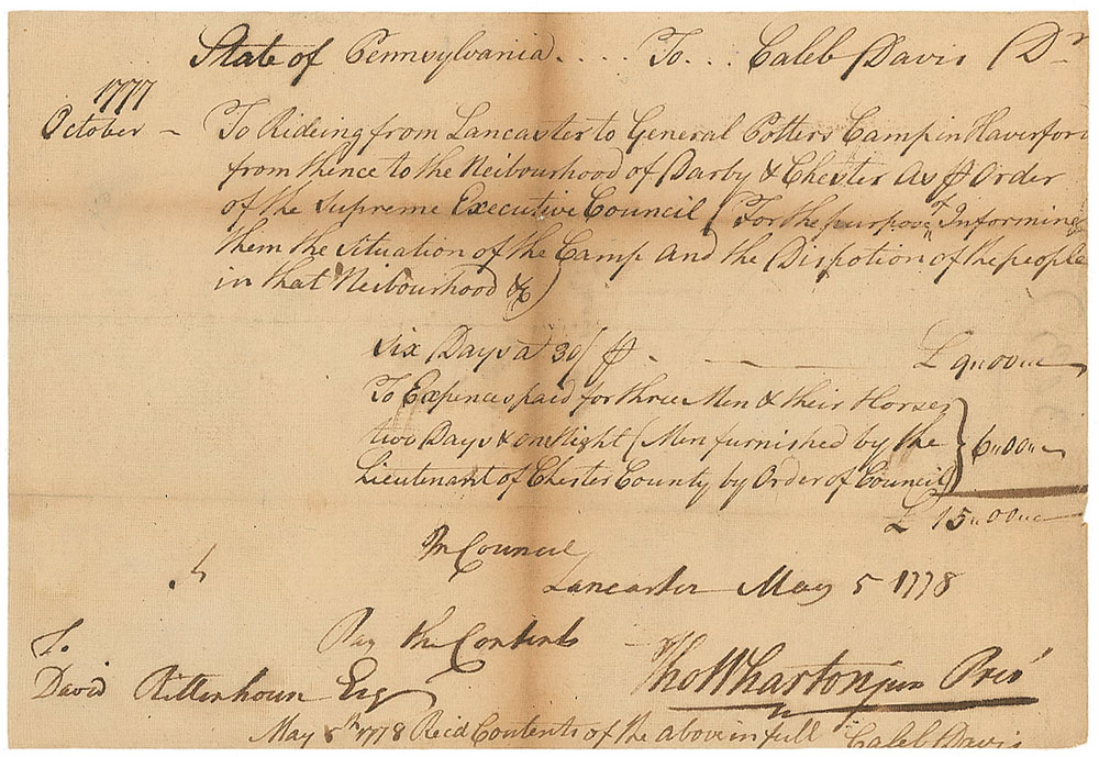 Pennsylvania merchant and politician (1735-1778) who served as the first President of Pennsylvania. Revolutionary War-dated manuscript DS, signed "Thos. Wharton Pres," one page, 8.25 x 5.5, May 5, 1778. Document, signed as the President of the Supreme Executive Council of Pennsylvania, ordering David Rittenhouse, a noted patriot, to pay "Caleb Davis…[for] Riding from Lancaster to General Potters Camp in Haverford from thence to the neighborhood of Darby and Chester as per order of the Supreme Executive Council for the purpose of informing them the situation of the camp and the disposition of the people in that neighborhood." Document has been professionally silked and inlaid to a slightly larger off-white sheet. In very good condition, with aforementioned silking, and scattered toning, with nothing detracting from the bold signature.