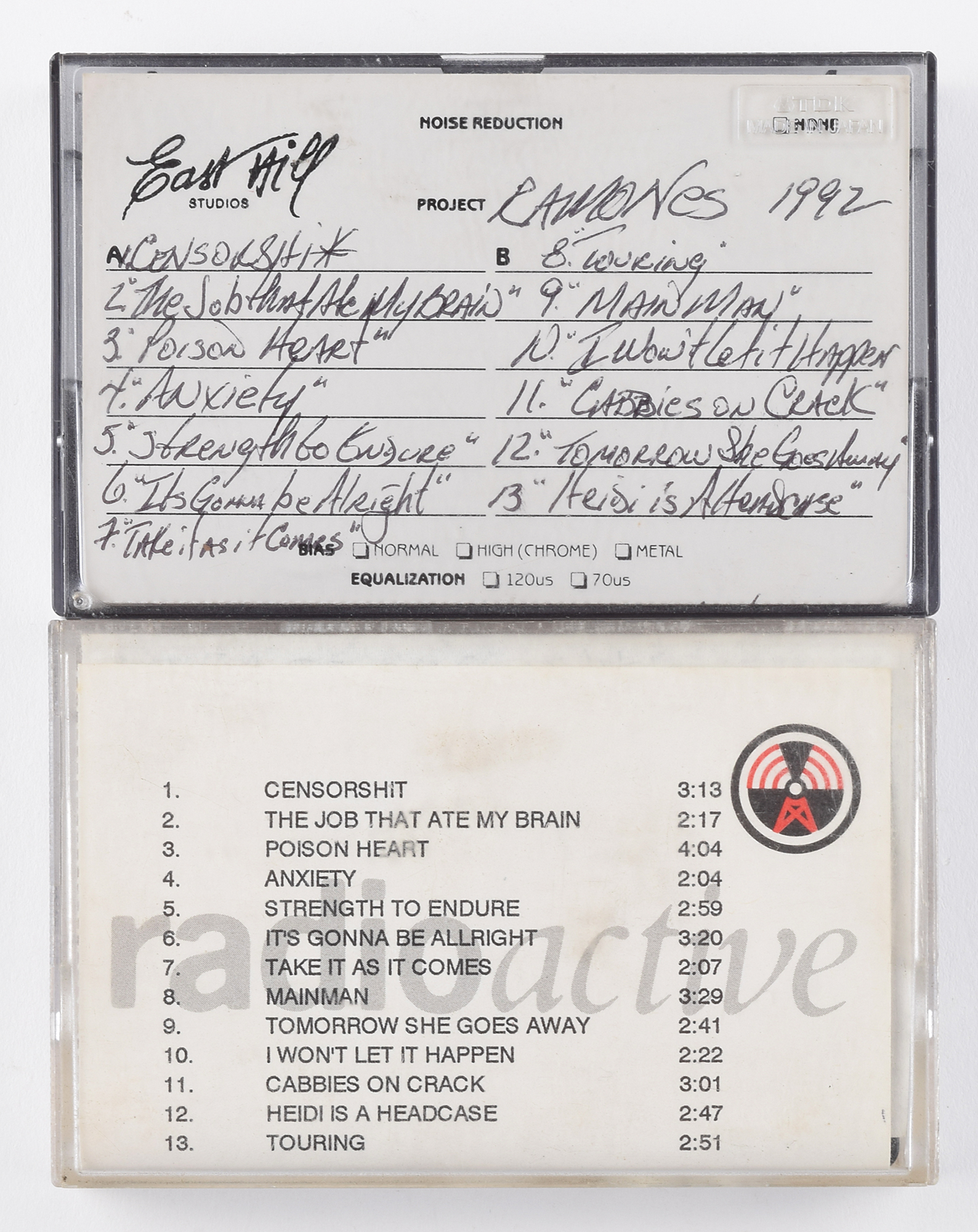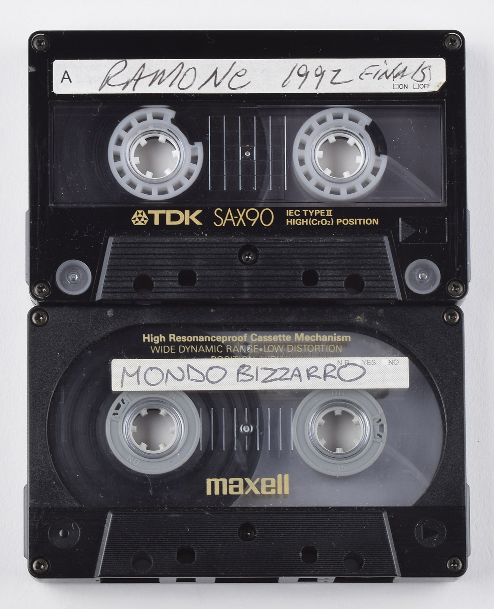 Two audio tapes from CJ Ramone’s personal collection: a tape from East Hill studios with a title and track list in an unknown hand, marked "Ramones, Date: 3/11/92," with the producer named as "Ed Stasium," featuring the thirteen tracks from Mondo Bizarro, in a slightly different order than the final album; and a tape with a printed Radioactive Records "Ramones Mondo Bizarro" label and track listing in the correct order. In overall fine condition. Includes audio CDs of each of the tapes. A complete track listing is available online at RRAuction.com.