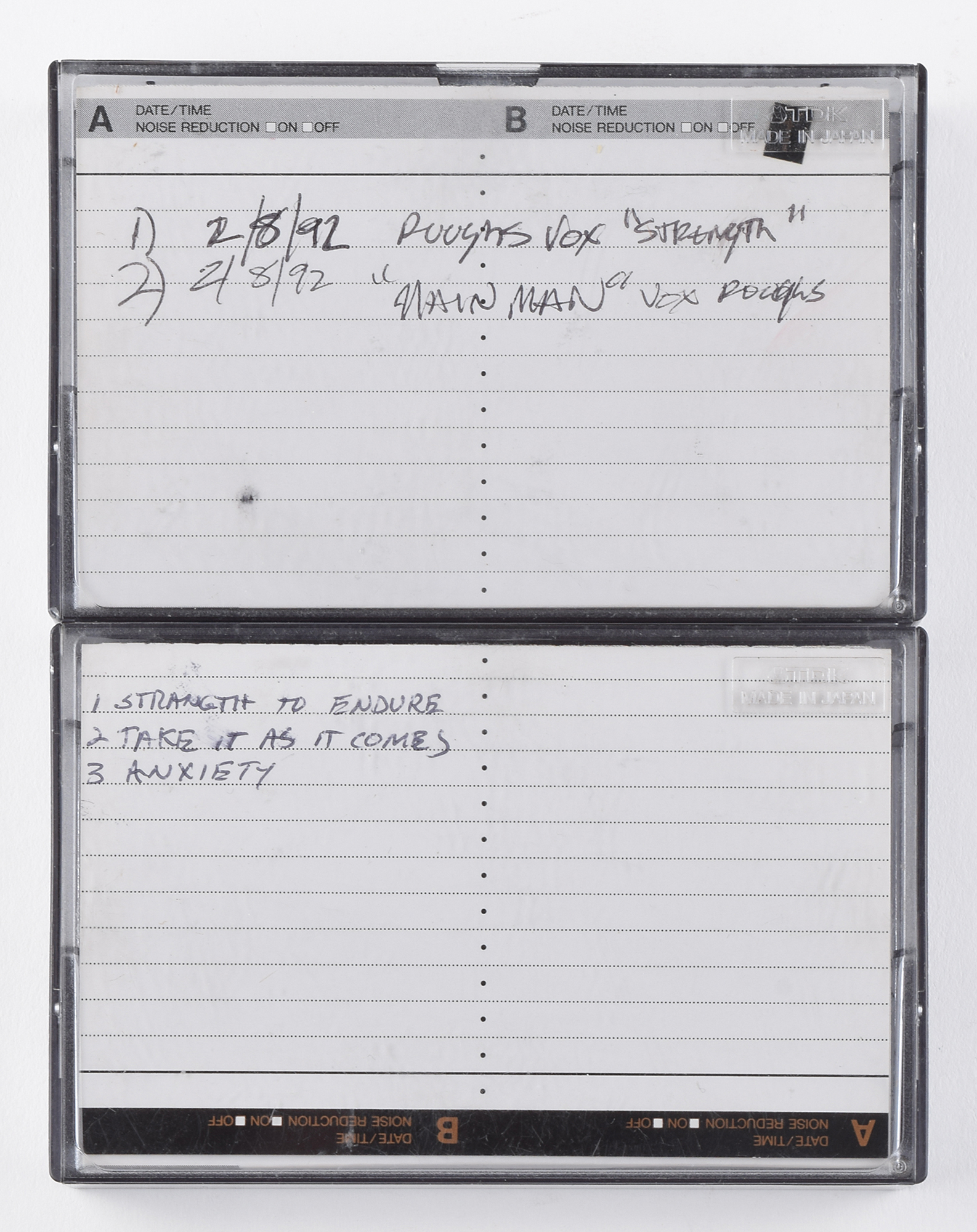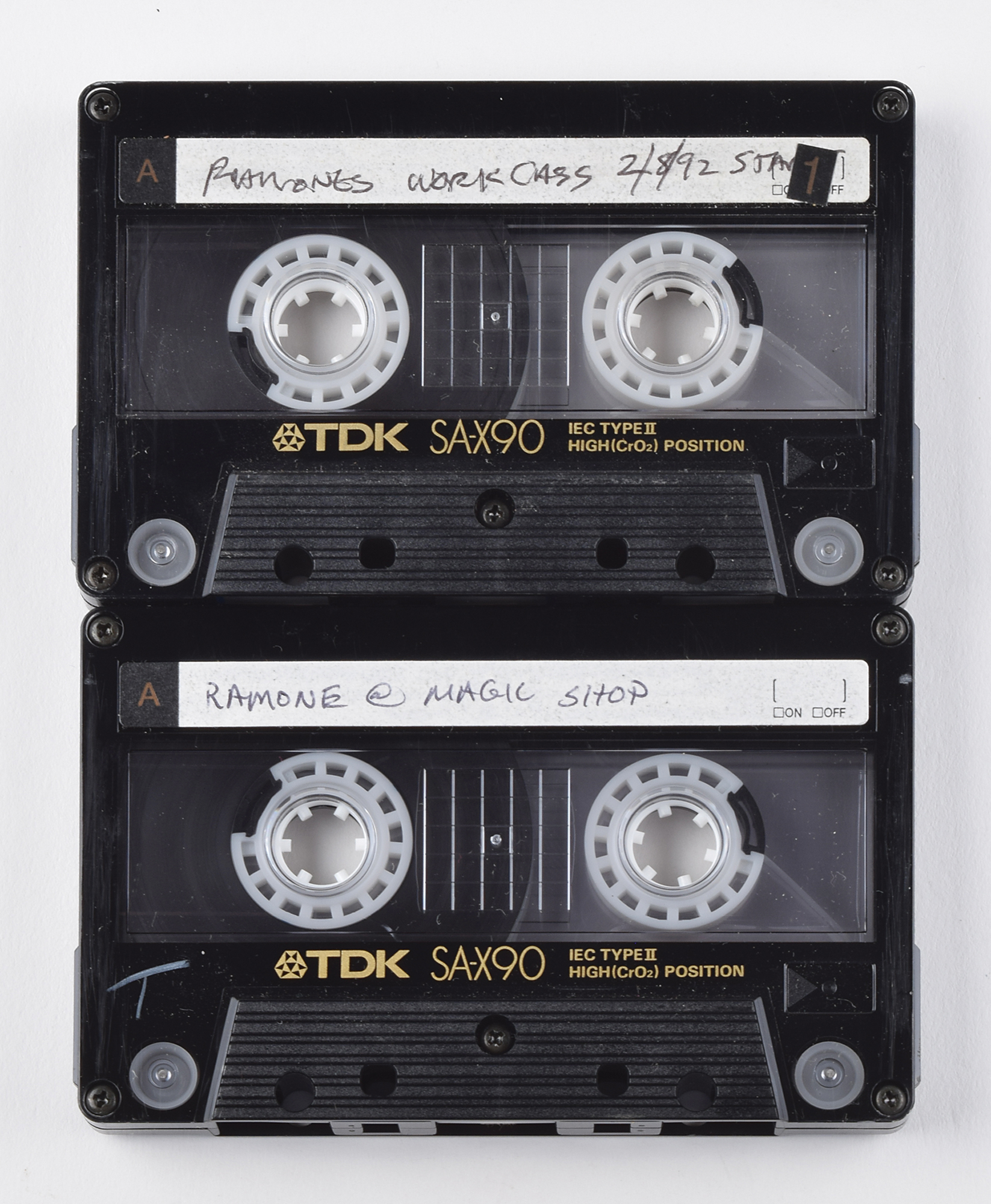 Two cassette tapes from CJ Ramone's personal collection, featuring songs from the 1992 album Mondo Bizarro: one marked "Ramones Cassette, Work, 2/8/92 Start," featuring the songs 'Strength to Endure' and 'Main Man,' identified as "1. 2/8/92 Roughs Vox 'Strength,' 2. 2/8/92 'Main Man' Vox Roughs"; and one marked "Ramones @ Magic Shop," featuring the tracks "Strength to Endure," "Take It As It Comes," and "Anxiety," all with scratch vocals performed by CJ. In overall fine condition. Includes audio CDs of each of the tapes. The Ramones recorded Mondo Bizarro at The Magic Shop in New York in February 1992, and it was released on September 1st; it was their first record to feature their new bassist, CJ Ramone.