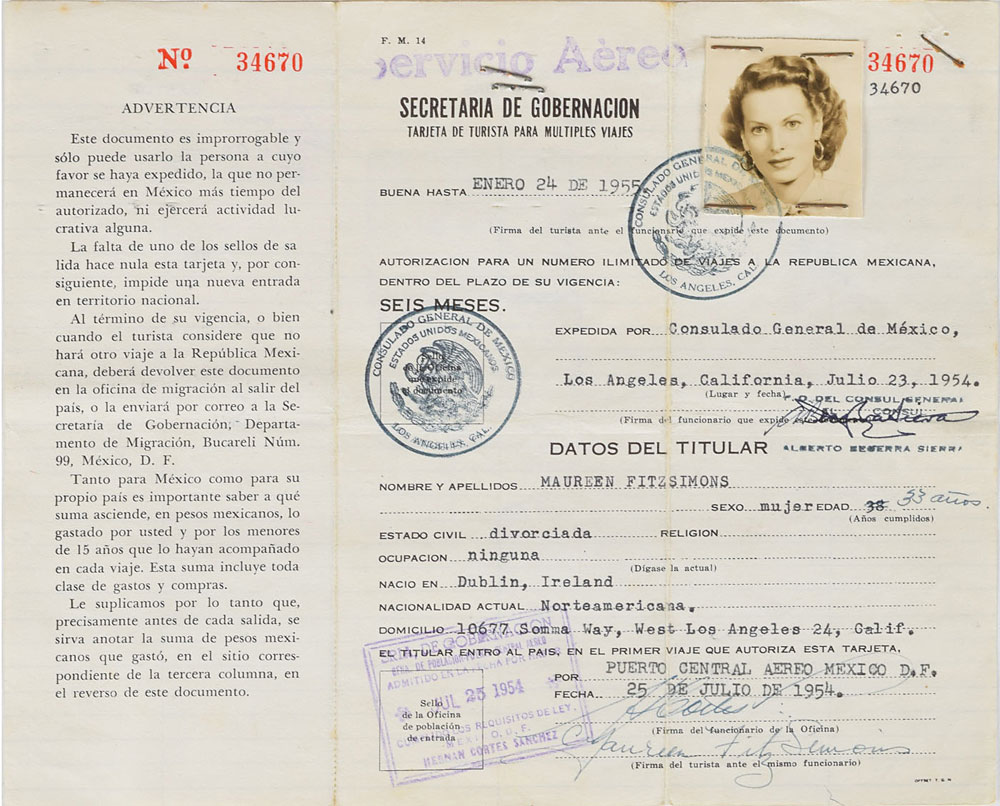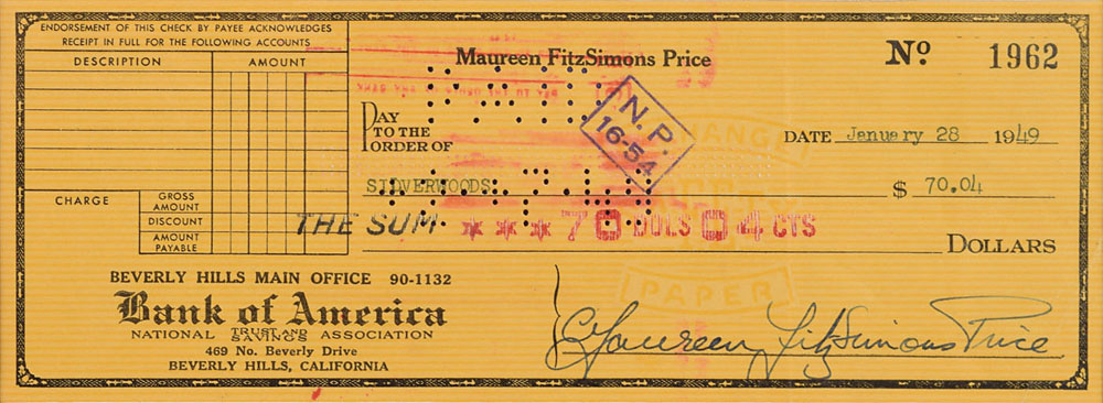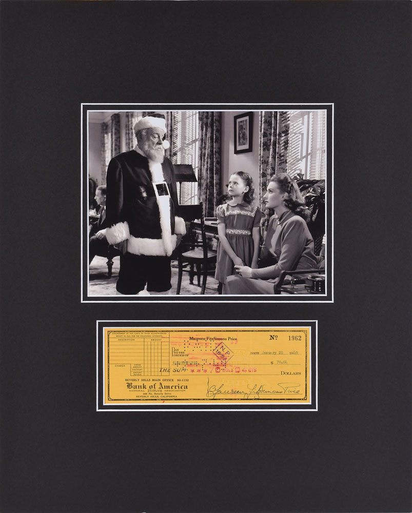 Four items: a personal check, filled out in type and signed by O'Hara, "Maureen FitzSimons Price," payable to Silverwoods for $70.04, January 28, 1949, double-matted with a photo from Miracle on 34th Street; an Air service tourist card issued by the Mexican consulate, signed “Maureen FitzSimons,” one page, 9.5 x 7.75, July 25, 1954, authorizing an unlimited number of trips to the Mexican republic within a six-month period, and listing O'Hara as "Maureen FitzSimons," with civil status as 'divorced,' occupation as 'none,' and birthplace as "Dublin, Ireland," with her tourist card photo, 1.5 x 1.75, stapled to the upper right corner; and a pair of Bank of America Savings and Commercial booklets belonging to “Maureen FitzSimons Price,” 2.25 x 3.75, dated between 1946 and 1947, both filled out in another hand. In overall fine condition. Accompanied by a Movie Magnet pamphlet with a preprinted signature of O’Hara on the front cover.