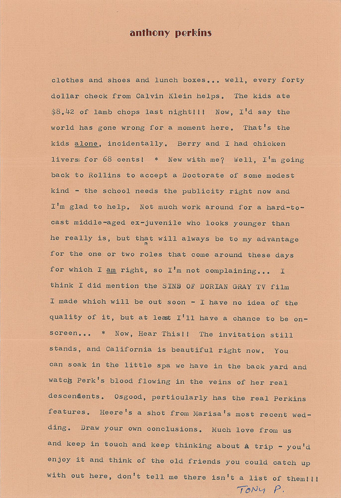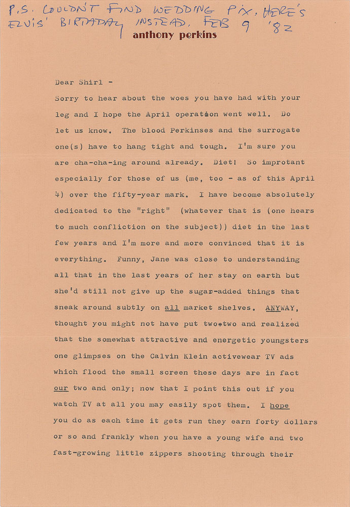 TLS signed “Tony P.,” two pages, 7.25 x 10.5, personal letterhead, February 9, 1982. Letter to Shirley Andrews, in part: "The blood Perkinses and the surrogate one(s) have to hang tight and tough. I'm sure you are cha-cha-ing around already. Diet! So important especially for those of us (me, too—as of this April 4) over the fifty-year mark. I have become absolutely dedicated to the 'right' (whatever that is (one hears too much confliction on the subject)) diet in the last few years and I'm more and more convinced that it is everything. Funny, Jane was close to understanding all that in the last years of her stay on earth but she'd still not give up the sugar-added things that sneak around subtly on all market shelves. Anyway, thought you might not have put two+two and realized that the somewhat attractive and energetic youngsters one glimpses on the Calvin Klein activewear TV ads which flood the small screen these days are in fact our two and only; now that I point this out if you watch TV at all you may easily spot them. I hope you do as each time it gets run they earn forty dollars or so and frankly when you have a young wife and two fast-growing little zippers shooting through their clothes and shoes and lunch boxes…well, every forty dollar check from Calvin Klein helps. The kids ate $8.42 of lamb chops last night!!!…New with me? Well, I'm going back to Rollins to accept a Doctorate of some modest kind—the school needs the publicity right now and I'm glad to help. Not much work around for a hard-to-cast middle-aged ex-juvenile who looks younger than he really is, but that will always be to my advantage for the one or two roles that come around these days for which I am right, so I'm not complaining." In fine condition. Accompanied by the original mailing envelope, addressed in Perkins's own hand.