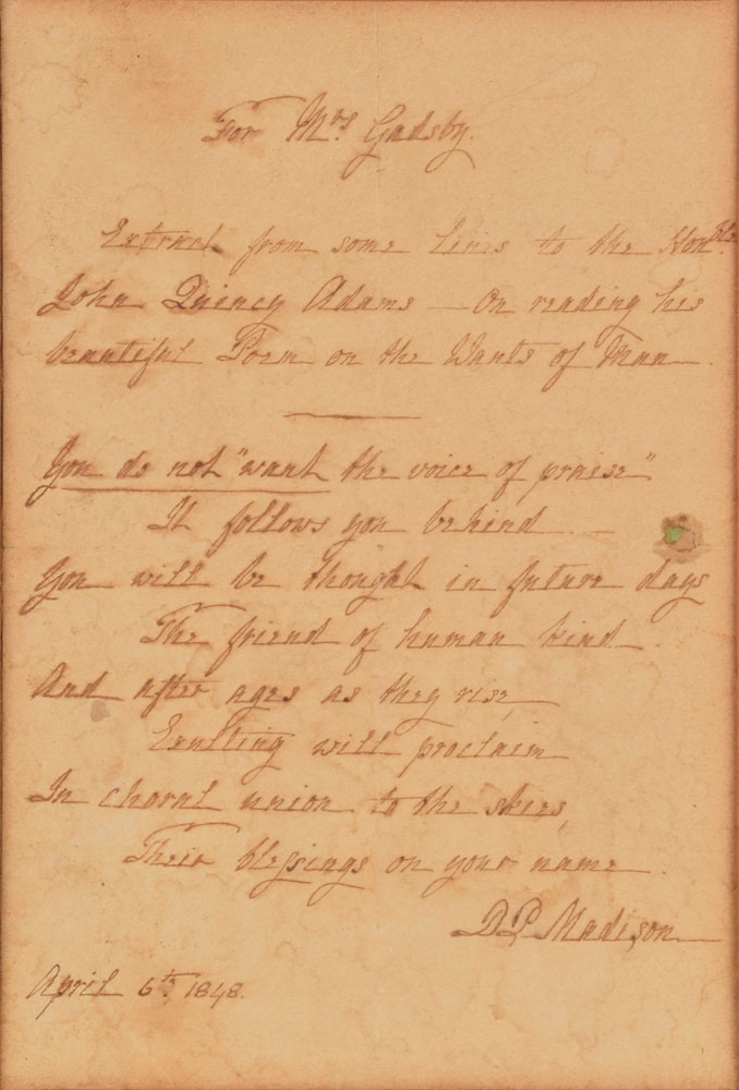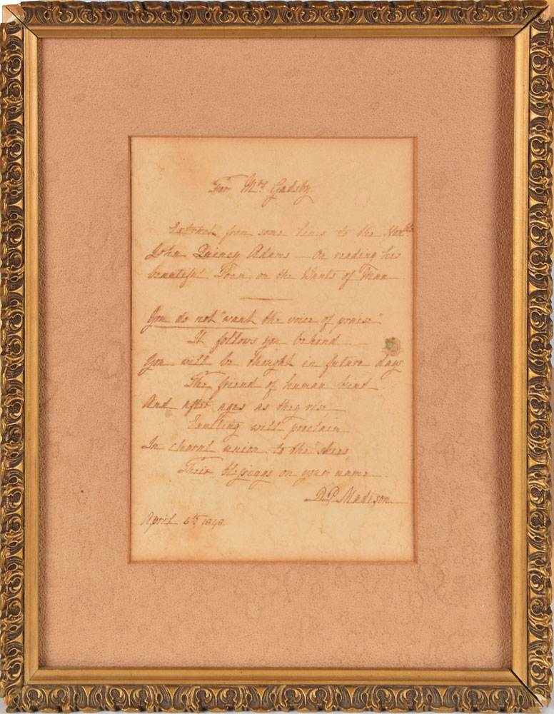 Rare AQS on an off-white 4 x 6 sheet, signed below in black ink, "D. P. Madison, April 6th, 1848," who adds an inscribed introduction above: "For Mrs. Gadsby, Extract from some lines to the Hon'ble John Quincy Adams—On reading his beautiful Poem on the Wants of Man." The quoted extract, in full: "You do not want the voice of praise / It follows you behind / You will be thought in future days / The friend of human kind / And after ages as they rise / Exulting will proclaim / In choral union to the skies / Their blessings on your name." Matted and framed without glass to an overall size of 7.5 x 9.75, with sheet permanently affixed to matting. In very good condition, with light staining and soiling. Originally published in 1841, 'The Wants of Man,' was the first poem in Adams' 1848 collection Poems of Religions and Society, and was later included in Ralph Waldo Emerson's 1874 book Parnassus. By Adams' own admission: 'Could I have chosen my own genius and condition, I would have made myself a great poet.' An exquisite offering from the 80-year-old former first lady.