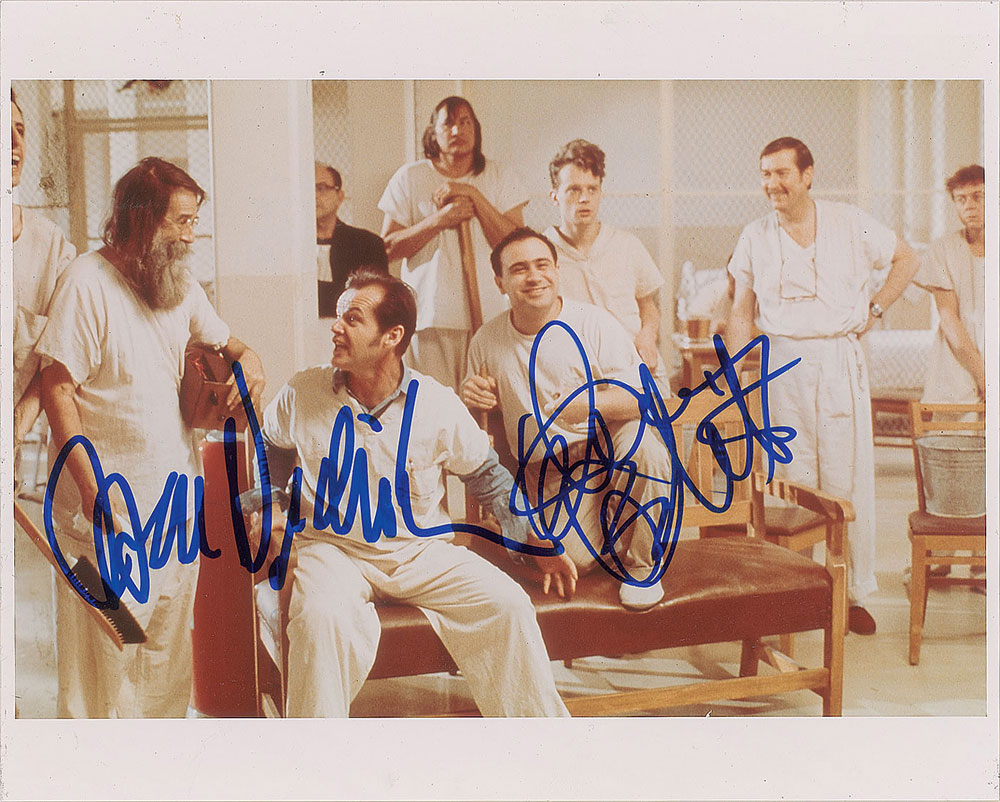Wonderful color glossy 10 x 8 photo of Randle McMurphy, Martini, and other patients from the Oscar-winning 1975 film One Flew Over the Cuckoo's Nest, signed in blue felt tip by Jack Nicholson and Danny DeVito. In fine condition.