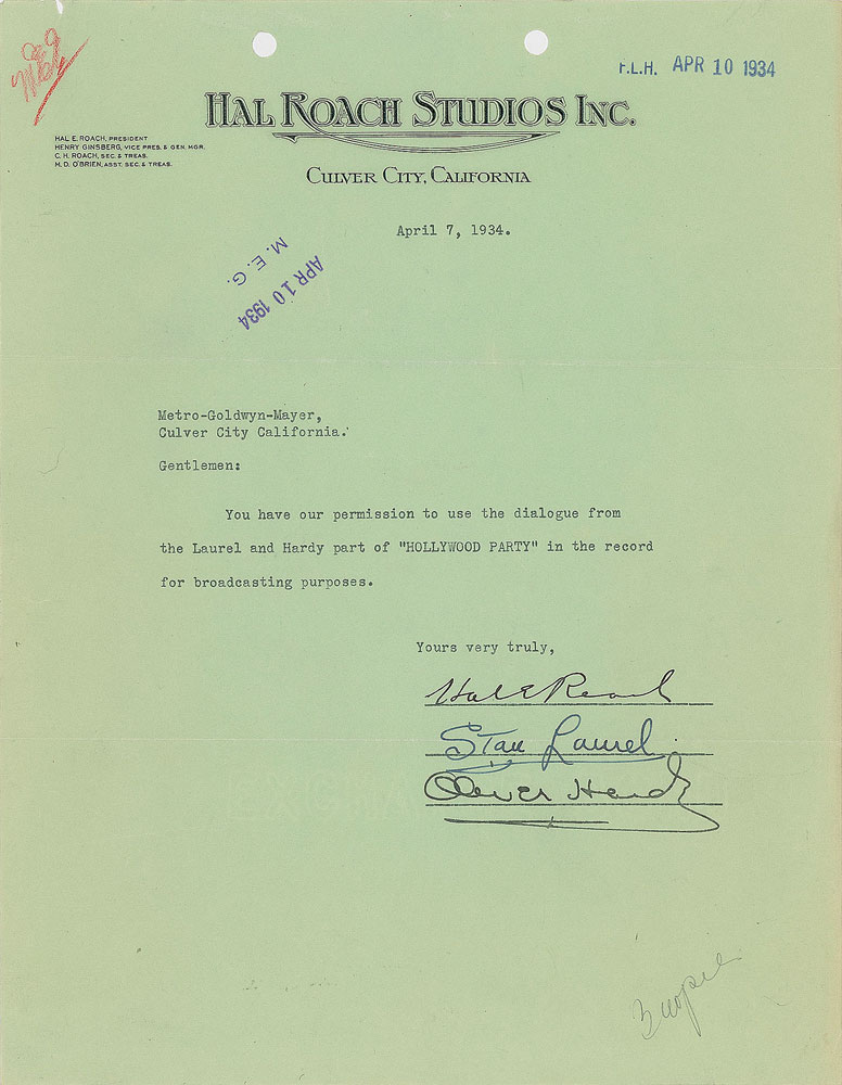 DS, one page, 8.5 x 11, April 7, 1934. Official Hal Roach Studios document granting MGM permission to use dialogue from a Laurel and Hardy segment, in full: "You have our permission to use the dialogue from the Laurel and Hardy part of 'Hollywood Party' in the record for broadcasting purposes." Signed at the conclusion in fountain pen, "Hal E. Roach," "Stan Laurel," and "Oliver Hardy." In fine condition. Produced by MGM in 1934, Hollywood Party was a musical film featuring numerous stars—Laurel and Hardy, the Three Stooges, Jimmy Durante, Lupe Velez, and Mickey Mouse (voiced by an uncredited Walt Disney)—in disconnected sequences. A fantastic document signed by not only the famed comedic duo, but by their longtime collaborator Hal Roach.