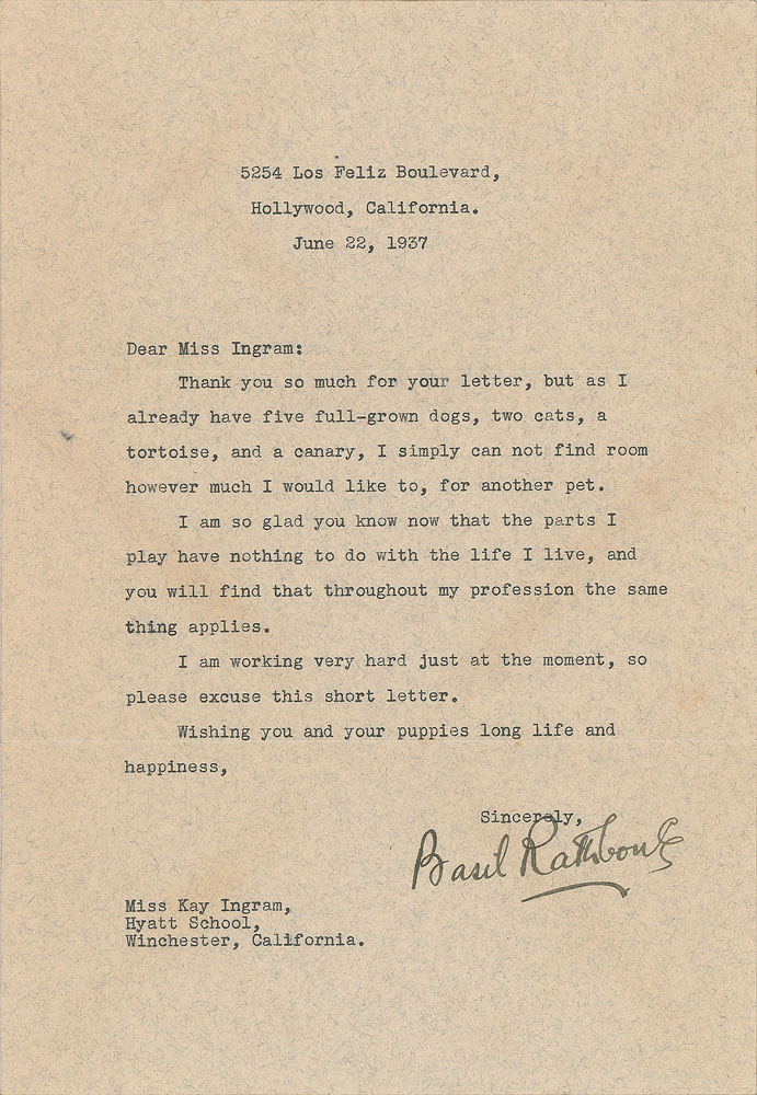 TLS, one page, 7.25 x 10.5, June 22, 1937. Letter to Kay Ingram at the Hyatt School in Winchester, California. In part: "Thank you so much for your letter, but as I already have five full-grown dogs, two cats, a tortoise, and a canary, I simply cannot find room however much I would like to, for another pet. I am so glad to know now that the parts I play have nothing to do with the life I live, and you will find that throughout my profession the same thing applies." In fine condition. Accompanied by the original mailing envelope.