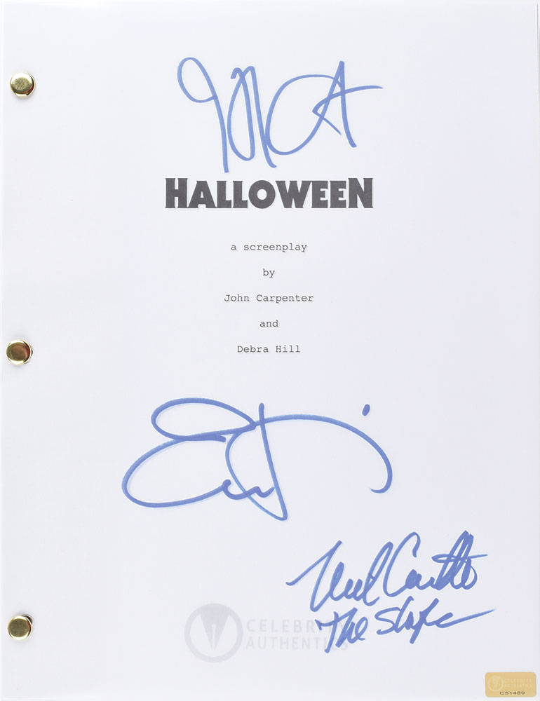 Limited edition brad-bound souvenir shooting script for the classic 1978 slasher film Halloween, numbered 50/50, 98 pages, 8.5 x 11, signed on the title sheet in blue felt tip by John Carpenter, Jamie Lee Curtis, and Nick Castle, who adds "The Shape." In fine condition. Accompanied by three certificates of authenticity from Celebrity Authentics.