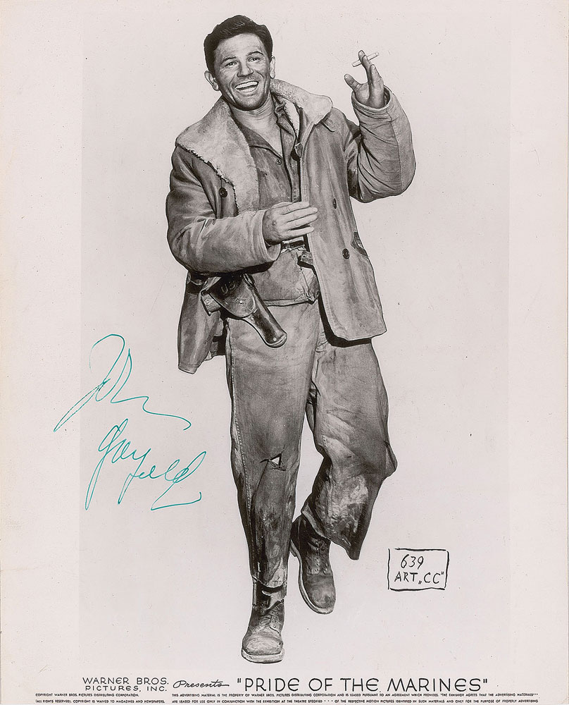 Oscar-nominated actor (1913-1952) who appeared in such classics as The Postman Always Rings Twice and Gentleman's Agreement. Blacklisted in Hollywood for his liberal beliefs amid the second Red Scare, the 39-year-old Garfield died of heart failure just two months after returning to the stage in a revival of Golden Boy. Two vintage glossy 8 x 10 photos of Garfield, including one Warner Bros. publicity still for Pride of the Marines and one studio portrait, each signed in fountain pen by the actor. In overall very good to fine condition, with scattered light creasing, and smudging to the signature on the portrait.