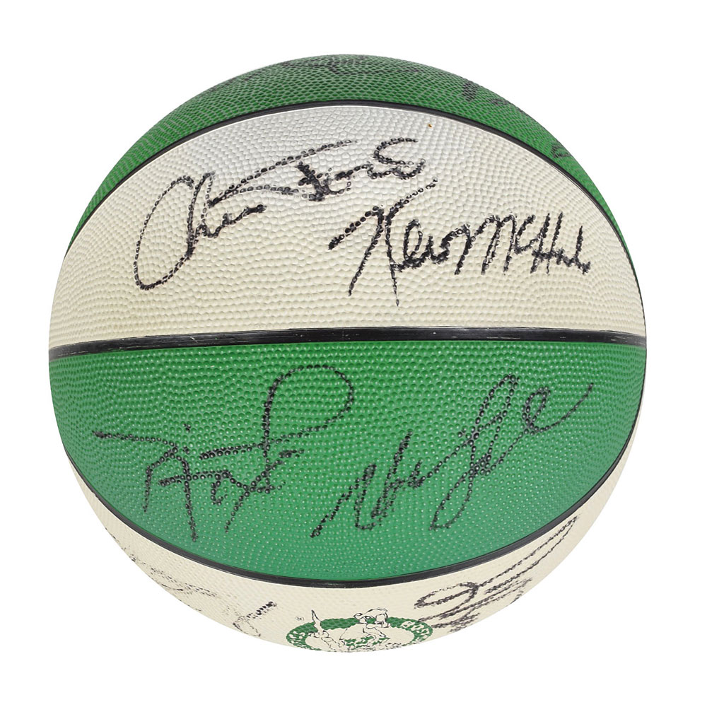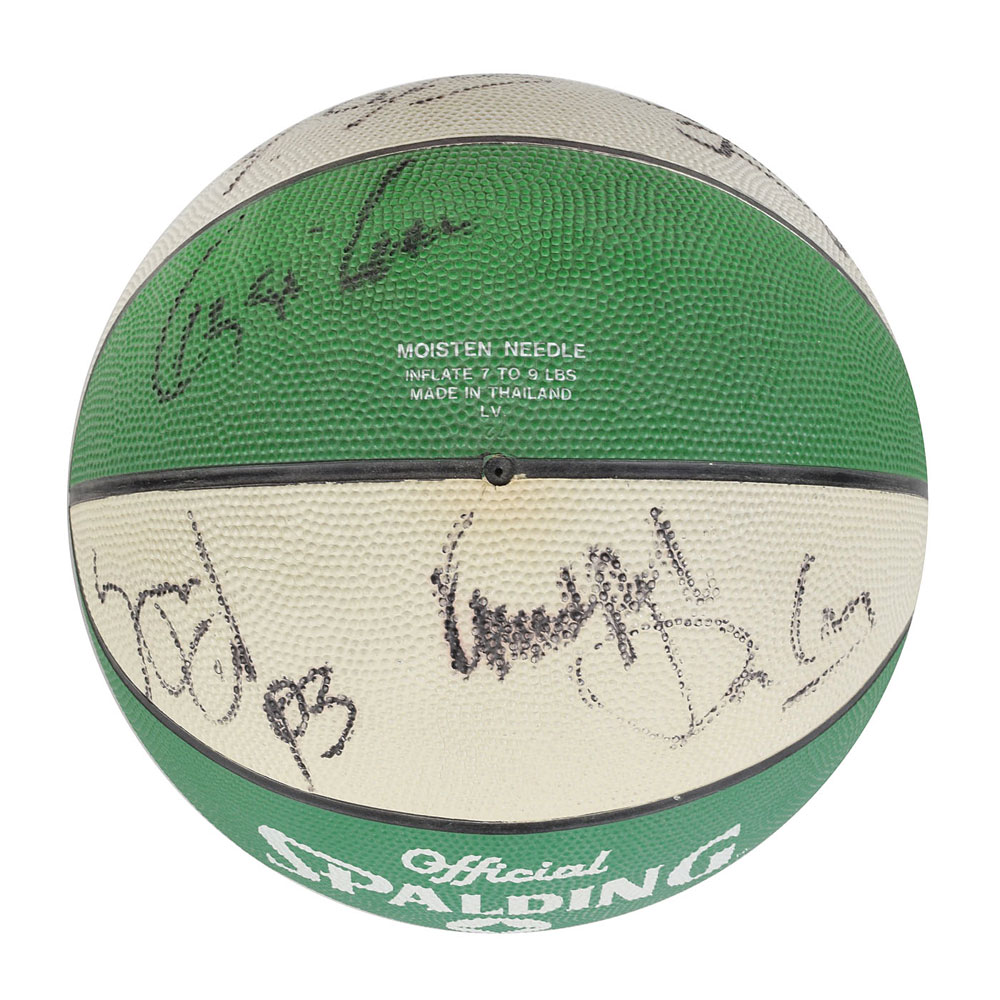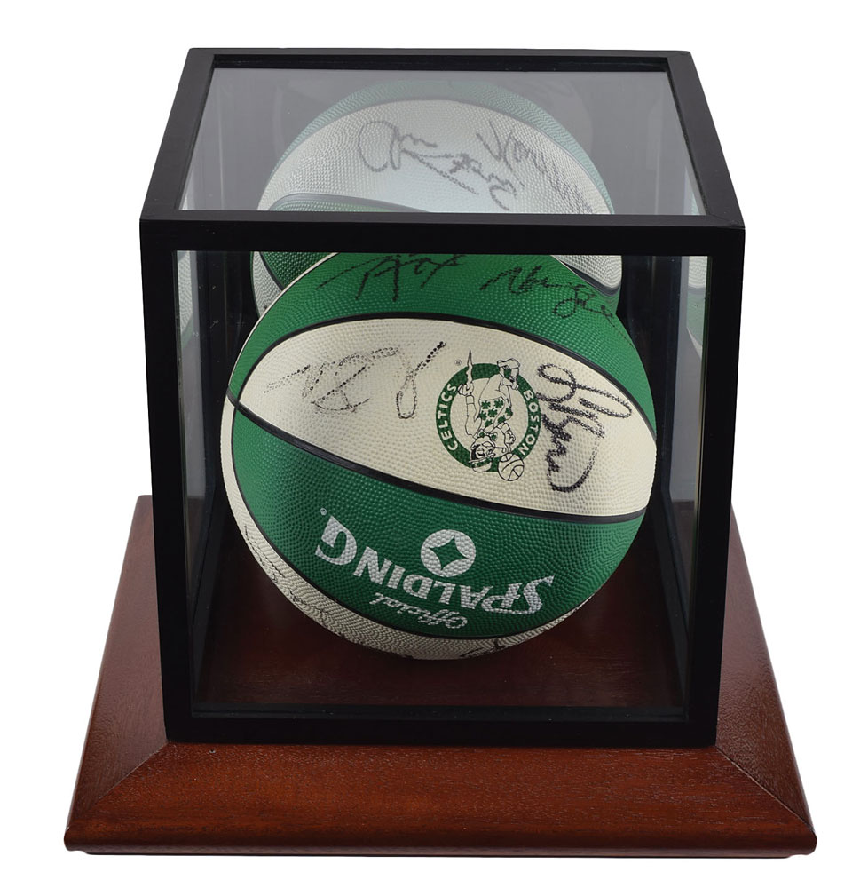Official Spalding Boston Celtics rubber basketball signed in black felt tip by fourteen Celtics players from the early 1990s, including: Larry Bird, Kevin McHale, Reggie Lewis, Joe Kleine, Rick Fox, and Head Coach Chris Ford. Includes a wooden display stand with window box. In fine condition.