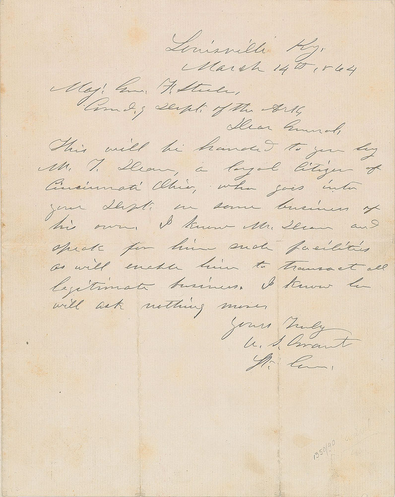 Civil War-dated ALS signed “U. S. Grant, Lt. Gen.,” 7.75 x 9.75, March 14, 1864. Written from Louisville, a letter to Major General Frederick Steele, in full: "This will be handed to you by Mr. T. Dean, a loyal citizen of Cincinnati, Ohio, who goes into your Dept. on some business of his own. I know Mr. Dean and speak for him such facilities as will enable him to transact all legitimate business. I know he will ask nothing more." In fine condition, with intersecting folds and light overall soiling. President Lincoln had promoted Grant to the rank of lieutenant general on March 2nd, giving him command of all Union Armies.